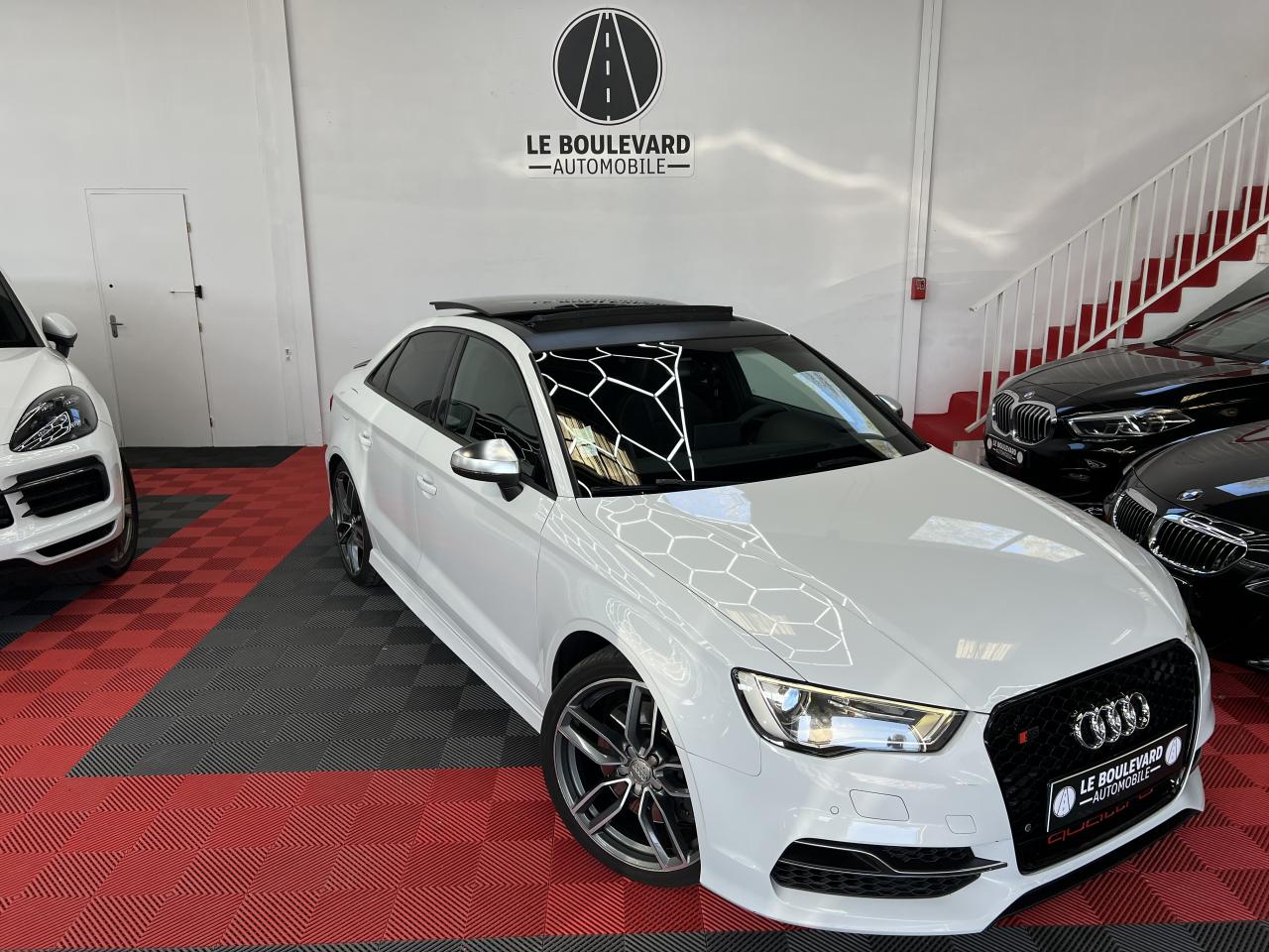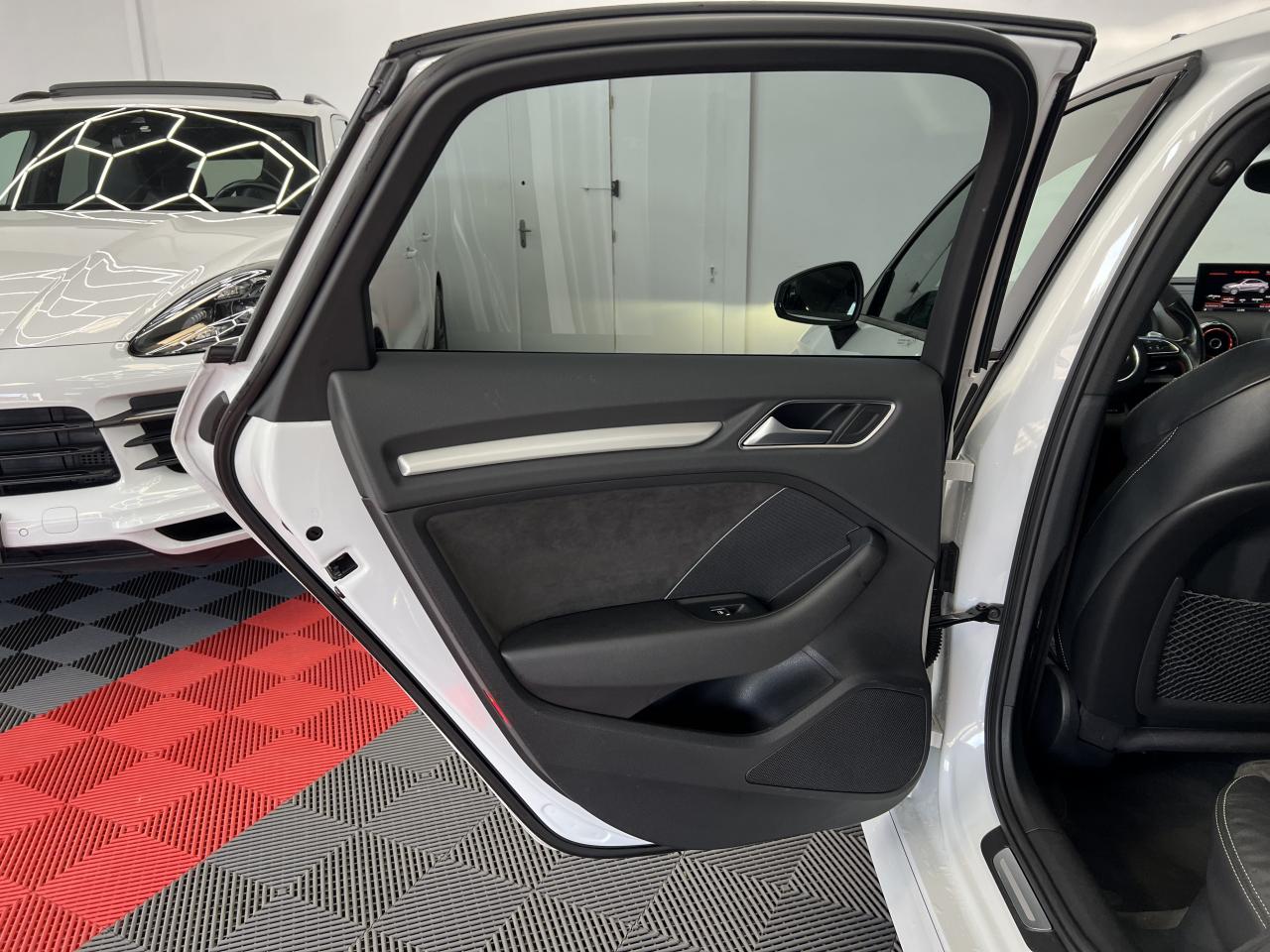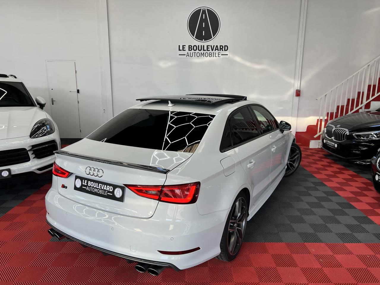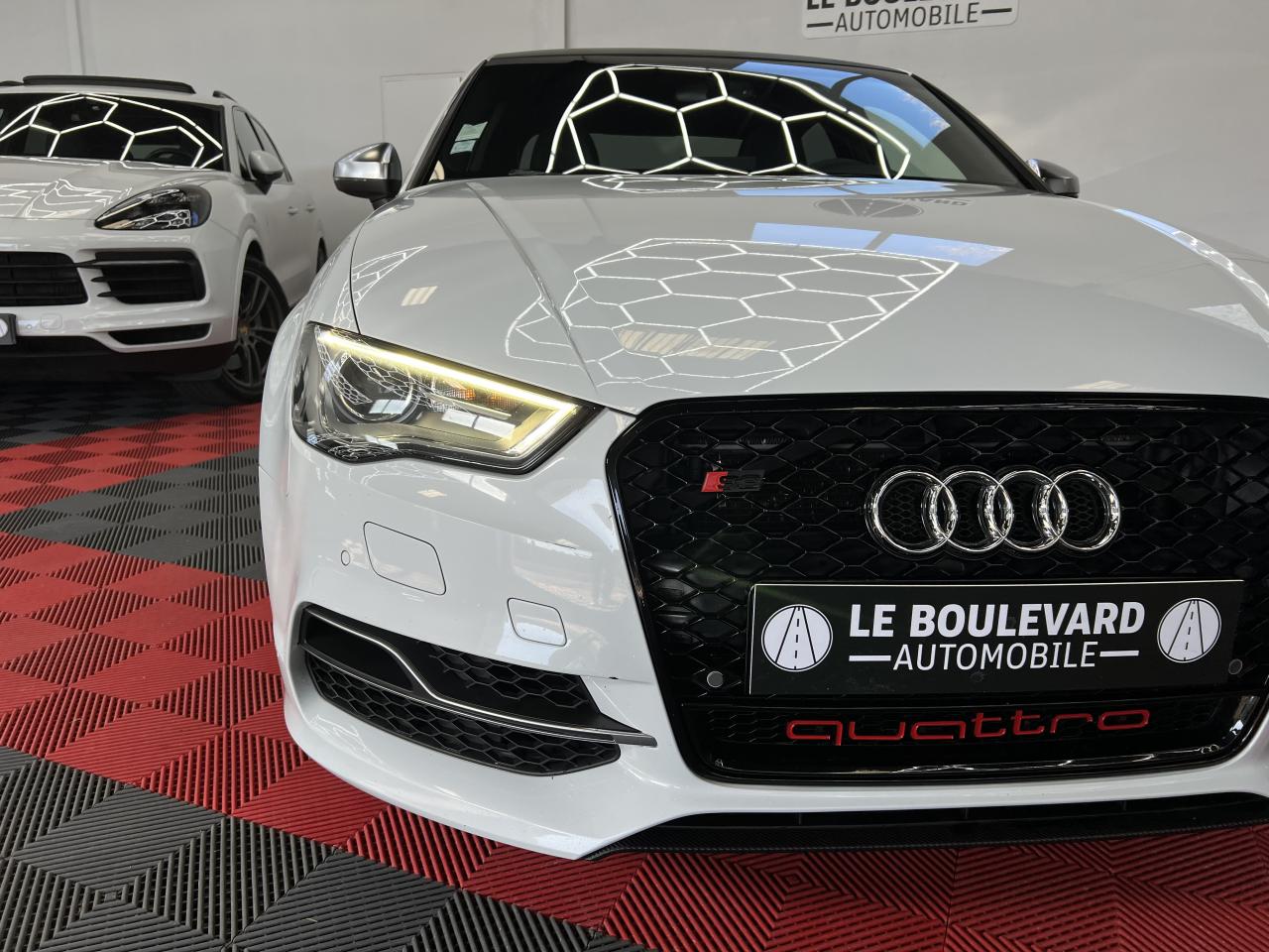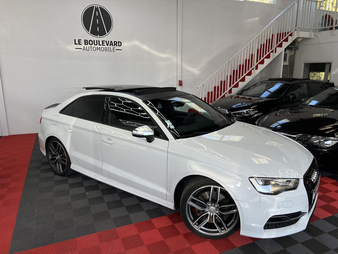 Accoudoir central avant, avec vide-poches relevable, inclinaison réglable et coulissant en longueurAirbag de genoux coté conducteurAirbags grand volume pour conducteur et passager avantAirbags latéraux à l'avant intégrés au dossier des siègesAlarme antivol : avec protection anti-remorquage par capteur d'angle d'inclinaisonAllume-cigare et cendrier amovible, couvercle chromé avec anneaux Audi, allume-cigare sur la console centrale au lieu de la prise 12 volts de sérieAntipatinage électronique ASRApplications décoratives sur les contre-portes et tableau de bord "Aluminium brossé mat"Audi Drive Select, permet différents réglagesAudi parking system à l'arrière facilitant le stationnement dans les limites du système à l'aide d'un signal sonoreAudi Premium Tracking SystemAudi Sound System avec 10 haut-parleursBecquet arrière S3 laqué dans la couleur de la carrosserie au niveau du capot de coffreBlocage électronique de différentiel (EDS)Boîte à gants grand volume côté passager avant, éclairéeCalandre Audi singleframe gris platine avec entretoises horizontales chromées, avec anneaux Audi chromés au centreCarrosserie galvanisée (entièrement galvanisée aux endroits sensibles à la corrosion)Ceintures de sécurité 3 points automatiques pour toutes les placesChâssis Sport S surbaissé de 25 mm, avec suspension et amortisseurs plus fermesCiel de pavillon en tissu noirClimatisation automatique Confort avec réglage asservi à la position du soleilContrôle électronique de stabilisation (ESC) désactivable, avec amplificateur hydraulique de freinage d'urgenceContrôle de ceinture attachée pour toutes les placesContrôle de la pression des pneusDétecteur de pluie et de luminositéDirection progressive contribuant à une augmentation de la dynamique de conduiteDossier de banquette arrière rabattable en deux parties 40/60 ou complètementEcrous de roues antivolFeux arrière avec feux de recul blancs et feux de brouillard arrière, incluant troisième feu stop surélevé et éclairage de plaque à LEDFeux de freinage adaptatifsFeux de route assistés : gestion automatique du passage de feux de croisement à pleins phares et inversementFixation pour sièges enfants ISOFIX et Top Tether pour les places arrière extérieuresIdentification du modèle/technologie sur le capot de coffre ; sur demande sans identification du modèle à l'arrièreInscription quattro sur la calandre, le capot de coffre et le tableau de bord côté passagerInscriptions S3 sur la calandre, le capot de coffre, les baguettes des seuils de portes, les étriers de freins avant, le volant Sport, le pommeau de levier de vitesses et le compte-toursJantes en aluminium coulé style 5 branches structurées avec pneus 225/40 R 18Lève-vitres à l'avant et à l'arrière, électriques, avec protection antipincement, ouverture/fermeture par le verrouillage centralisé, fonction ouverture/fermeture par impulsionLave-essuie-glace 2 vitesses, 4 intervalles de balayage réglablesMMI GPS plus avec données de navigationOEilletons de fixation, 4 dans le coffre, pour maintenir les bagages et objets dans le coffre, points de fixation pour le filet mixte en optionOutillage de bord dans le coffre incluant un cricPédalier en acier inoxydable brosséPack aluminium extérieurPack aluminium intérieurPack EclairagePack rangement et coffrePare-brise acoustique, améliore l'isolation phonique du pare-brise et réduit les bruits extérieursPare-chocs laqués dans la couleur de carrosserie avec prises d'air latérales accentuées, extension de bas de caisse ainsi que diffuseur S à l'arrière au design résolument sportifPare-soleil rabattables et pivotants, côtés conducteur et passager avant, avec miroir de courtoisie occultablePatères à vêtements sur les montants de pavillon centraux, à gauche et à droite, simplesPoignées de maintien. 4 poignées avec mécanisme amortisseur, rabattables, encastrées dans le pavillonPréparation pour téléphone portable (Bluetooth), commande sur volant multifonction, mains libres et audiostreamingPrise de courant 12 volts sur la console centrale à l'avantProtection antidémarrage électronique intégrée à la gestion du moteur ; activation automatique par la clé du véhiculeProtection latérale anticollision avec barres extrêmement rigides dans les portières et une structure latérale de carrosserie renforcéeQuattro: transmission intégrale permanente avec répartition asymétrique et dynamique de coupleRégulateur de vitesse avec maintien constant de la vitesse souhaitée à partir d'environ 30 km/hRétroviseur intérieur jour/nuit automatiqueRétroviseurs extérieurs style aluminium avec rappels de clignotant à diodes, asphérique côté conducteur, convexe côté passager avant, dégivrants et escamotables électriquementRangements dans les contre-portes à l'avant avec casier de rangement pour boissons, rangements dans les contre-portes arrièreRecommandation de repos qui analyse le comportement routier au moyen de différents capteursRoue de secours temporaire de type galetteSellerie mixte en Alcantara et cuir MilanoSeuils de portes avec inserts en aluminium et emblème S3Sièges conducteur et passager avant réglables en hauteurSièges Sport à l'avant avec estampillage SSignal sonore pour oubli d'extinction des feuxSorties d'échappement chromées, visibles et doubles, 2 sorties ovales chromées à gauche et à droiteSupport pour téléphone portable et clé avec compatiment séparé pour le rangement du téléphone portable et la clé du véhicule. Rangement intégré avec encadrement chromé sur la console centraleSystème d'airbags de têteSystème d'information du conducteur avec écran couleur haute résolution de 3,5 poucesSystème de freinage avec antiblocage (ABS) et répartiteur électronique de freinage (EBV) ; amplificateur hydraulique de freinage d'urgence à 2 rapports (Dual Rate)Système de ventilation et chauffage 4 diffuseurs d'air rondsTémoins de contr