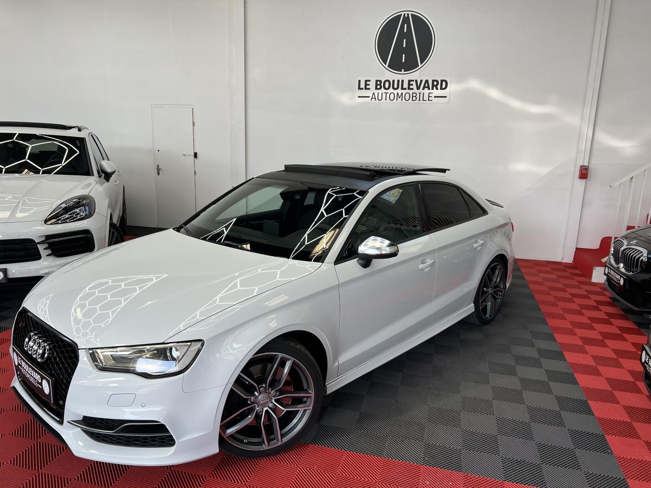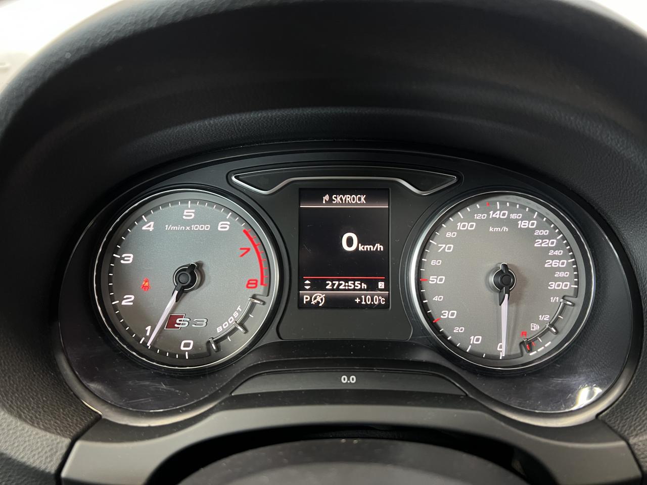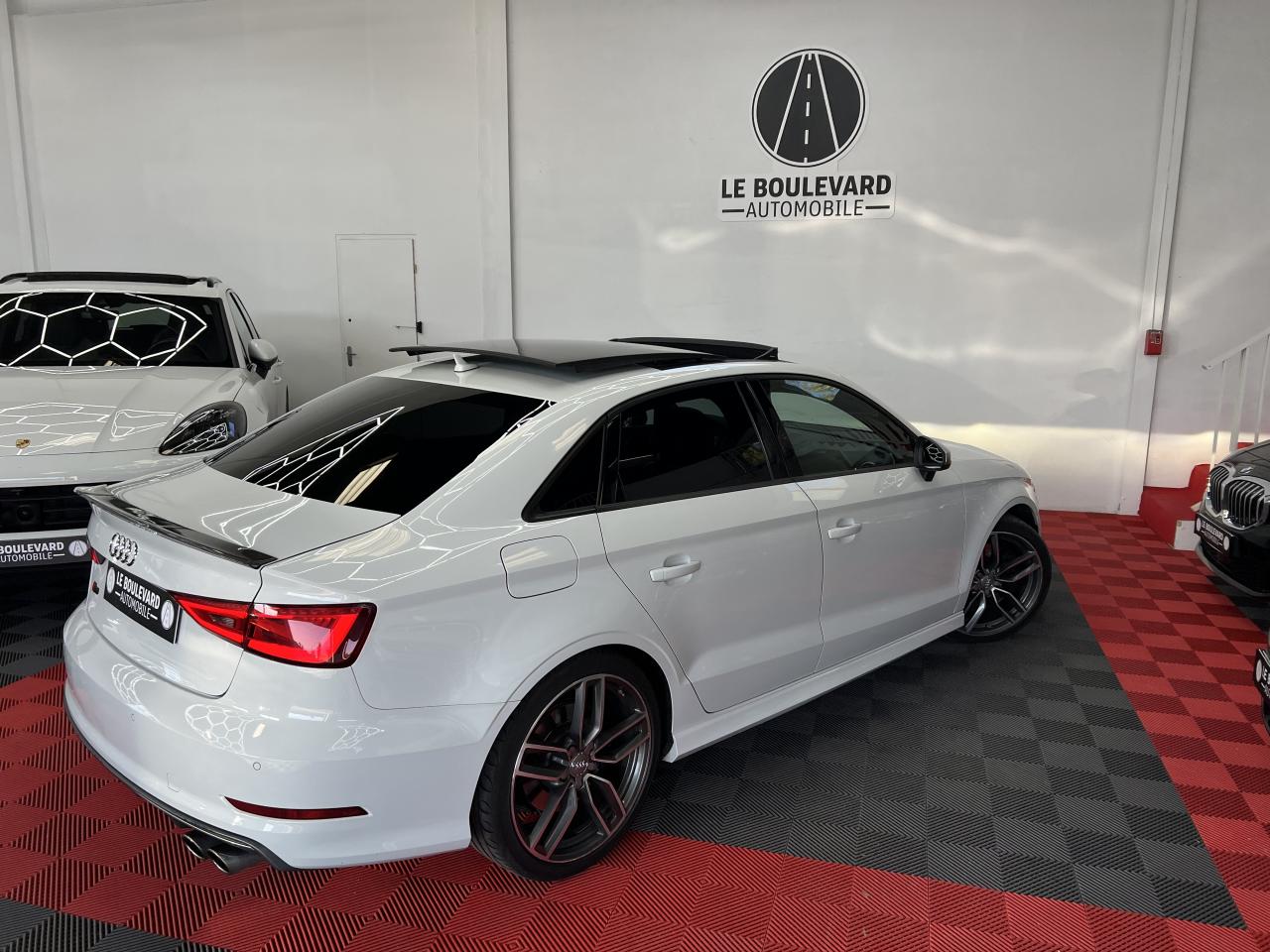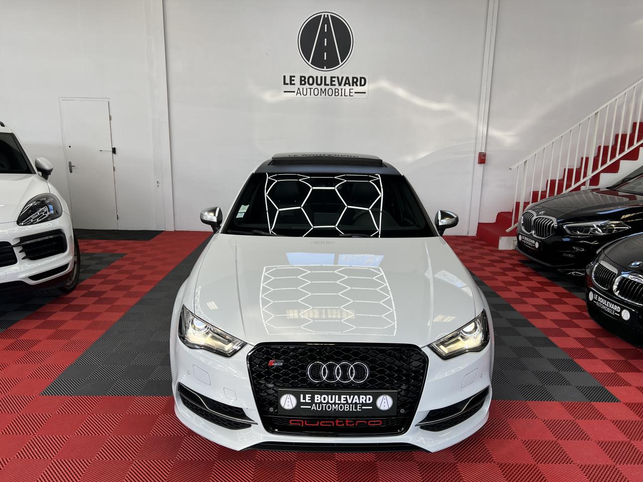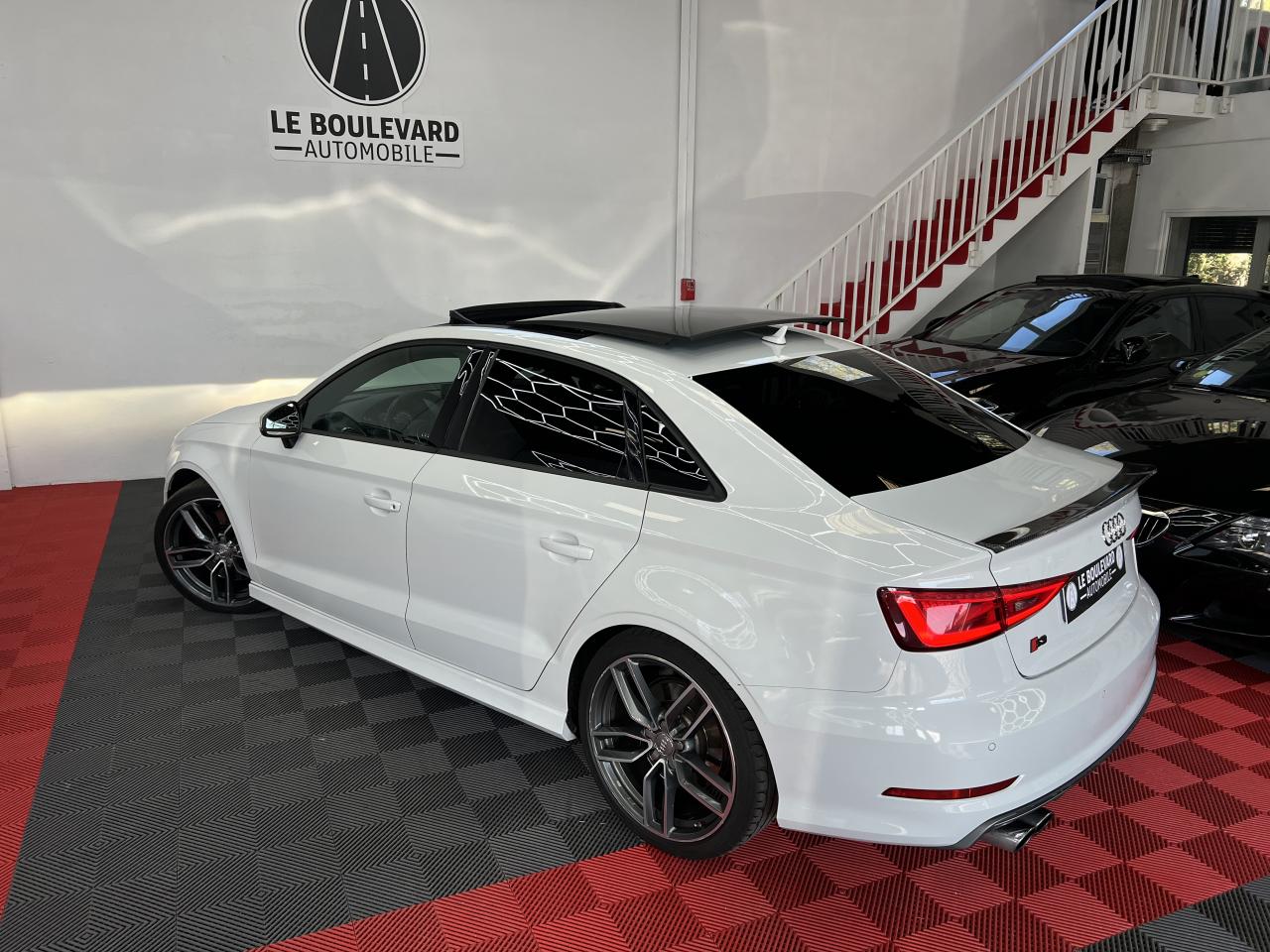 Accoudoir central avant, avec vide-poches relevable, inclinaison réglable et coulissant en longueurAirbag de genoux coté conducteurAirbags grand volume pour conducteur et passager avantAirbags latéraux à l'avant intégrés au dossier des siègesAlarme antivol : avec protection anti-remorquage par capteur d'angle d'inclinaisonAllume-cigare et cendrier amovible, couvercle chromé avec anneaux Audi, allume-cigare sur la console centrale au lieu de la prise 12 volts de sérieAntipatinage électronique ASRApplications décoratives sur les contre-portes et tableau de bord "Aluminium brossé mat"Audi Drive Select, permet différents réglagesAudi parking system à l'arrière facilitant le stationnement dans les limites du système à l'aide d'un signal sonoreAudi Premium Tracking SystemAudi Sound System avec 10 haut-parleursBecquet arrière S3 laqué dans la couleur de la carrosserie au niveau du capot de coffreBlocage électronique de différentiel (EDS)Boîte à gants grand volume côté passager avant, éclairéeCalandre Audi singleframe gris platine avec entretoises horizontales chromées, avec anneaux Audi chromés au centreCarrosserie galvanisée (entièrement galvanisée aux endroits sensibles à la corrosion)Ceintures de sécurité 3 points automatiques pour toutes les placesChâssis Sport S surbaissé de 25 mm, avec suspension et amortisseurs plus fermesCiel de pavillon en tissu noirClimatisation automatique Confort avec réglage asservi à la position du soleilContrôle électronique de stabilisation (ESC) désactivable, avec amplificateur hydraulique de freinage d'urgenceContrôle de ceinture attachée pour toutes les placesContrôle de la pression des pneusDétecteur de pluie et de luminositéDirection progressive contribuant à une augmentation de la dynamique de conduiteDossier de banquette arrière rabattable en deux parties 40/60 ou complètementEcrous de roues antivolFeux arrière avec feux de recul blancs et feux de brouillard arrière, incluant troisième feu stop surélevé et éclairage de plaque à LEDFeux de freinage adaptatifsFeux de route assistés : gestion automatique du passage de feux de croisement à pleins phares et inversementFixation pour sièges enfants ISOFIX et Top Tether pour les places arrière extérieuresIdentification du modèle/technologie sur le capot de coffre ; sur demande sans identification du modèle à l'arrièreInscription quattro sur la calandre, le capot de coffre et le tableau de bord côté passagerInscriptions S3 sur la calandre, le capot de coffre, les baguettes des seuils de portes, les étriers de freins avant, le volant Sport, le pommeau de levier de vitesses et le compte-toursJantes en aluminium coulé style 5 branches structurées avec pneus 225/40 R 18Lève-vitres à l'avant et à l'arrière, électriques, avec protection antipincement, ouverture/fermeture par le verrouillage centralisé, fonction ouverture/fermeture par impulsionLave-essuie-glace 2 vitesses, 4 intervalles de balayage réglablesMMI GPS plus avec données de navigationOEilletons de fixation, 4 dans le coffre, pour maintenir les bagages et objets dans le coffre, points de fixation pour le filet mixte en optionOutillage de bord dans le coffre incluant un cricPédalier en acier inoxydable brosséPack aluminium extérieurPack aluminium intérieurPack EclairagePack rangement et coffrePare-brise acoustique, améliore l'isolation phonique du pare-brise et réduit les bruits extérieursPare-chocs laqués dans la couleur de carrosserie avec prises d'air latérales accentuées, extension de bas de caisse ainsi que diffuseur S à l'arrière au design résolument sportifPare-soleil rabattables et pivotants, côtés conducteur et passager avant, avec miroir de courtoisie occultablePatères à vêtements sur les montants de pavillon centraux, à gauche et à droite, simplesPoignées de maintien. 4 poignées avec mécanisme amortisseur, rabattables, encastrées dans le pavillonPréparation pour téléphone portable (Bluetooth), commande sur volant multifonction, mains libres et audiostreamingPrise de courant 12 volts sur la console centrale à l'avantProtection antidémarrage électronique intégrée à la gestion du moteur ; activation automatique par la clé du véhiculeProtection latérale anticollision avec barres extrêmement rigides dans les portières et une structure latérale de carrosserie renforcéeQuattro: transmission intégrale permanente avec répartition asymétrique et dynamique de coupleRégulateur de vitesse avec maintien constant de la vitesse souhaitée à partir d'environ 30 km/hRétroviseur intérieur jour/nuit automatiqueRétroviseurs extérieurs style aluminium avec rappels de clignotant à diodes, asphérique côté conducteur, convexe côté passager avant, dégivrants et escamotables électriquementRangements dans les contre-portes à l'avant avec casier de rangement pour boissons, rangements dans les contre-portes arrièreRecommandation de repos qui analyse le comportement routier au moyen de différents capteursRoue de secours temporaire de type galetteSellerie mixte en Alcantara et cuir MilanoSeuils de portes avec inserts en aluminium et emblème S3Sièges conducteur et passager avant réglables en hauteurSièges Sport à l'avant avec estampillage SSignal sonore pour oubli d'extinction des feuxSorties d'échappement chromées, visibles et doubles, 2 sorties ovales chromées à gauche et à droiteSupport pour téléphone portable et clé avec compatiment séparé pour le rangement du téléphone portable et la clé du véhicule. Rangement intégré avec encadrement chromé sur la console centraleSystème d'airbags de têteSystème d'information du conducteur avec écran couleur haute résolution de 3,5 poucesSystème de freinage avec antiblocage (ABS) et répartiteur électronique de freinage (EBV) ; amplificateur hydraulique de freinage d'urgence à 2 rapports (Dual Rate)Système de ventilation et chauffage 4 diffuseurs d'air rondsTémoins de contr