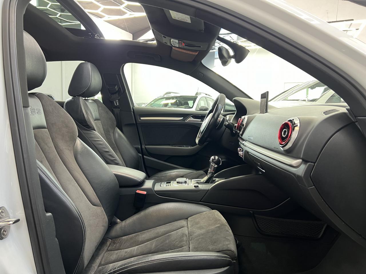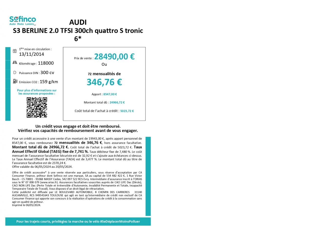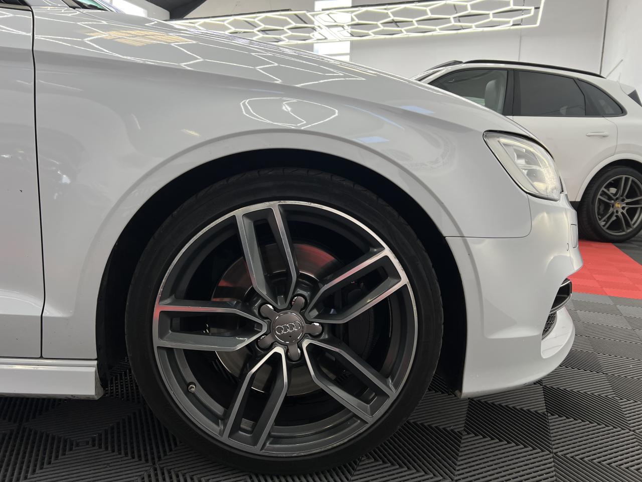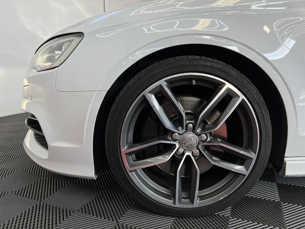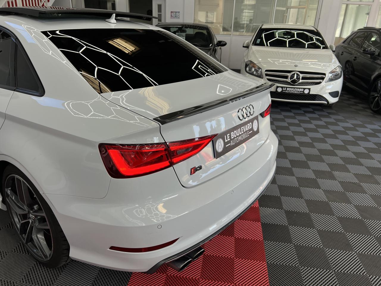 Accoudoir central avant, avec vide-poches relevable, inclinaison réglable et coulissant en longueurAirbag de genoux coté conducteurAirbags grand volume pour conducteur et passager avantAirbags latéraux à l'avant intégrés au dossier des siègesAlarme antivol : avec protection anti-remorquage par capteur d'angle d'inclinaisonAllume-cigare et cendrier amovible, couvercle chromé avec anneaux Audi, allume-cigare sur la console centrale au lieu de la prise 12 volts de sérieAntipatinage électronique ASRApplications décoratives sur les contre-portes et tableau de bord "Aluminium brossé mat"Audi Drive Select, permet différents réglagesAudi parking system à l'arrière facilitant le stationnement dans les limites du système à l'aide d'un signal sonoreAudi Premium Tracking SystemAudi Sound System avec 10 haut-parleursBecquet arrière S3 laqué dans la couleur de la carrosserie au niveau du capot de coffreBlocage électronique de différentiel (EDS)Boîte à gants grand volume côté passager avant, éclairéeCalandre Audi singleframe gris platine avec entretoises horizontales chromées, avec anneaux Audi chromés au centreCarrosserie galvanisée (entièrement galvanisée aux endroits sensibles à la corrosion)Ceintures de sécurité 3 points automatiques pour toutes les placesChâssis Sport S surbaissé de 25 mm, avec suspension et amortisseurs plus fermesCiel de pavillon en tissu noirClimatisation automatique Confort avec réglage asservi à la position du soleilContrôle électronique de stabilisation (ESC) désactivable, avec amplificateur hydraulique de freinage d'urgenceContrôle de ceinture attachée pour toutes les placesContrôle de la pression des pneusDétecteur de pluie et de luminositéDirection progressive contribuant à une augmentation de la dynamique de conduiteDossier de banquette arrière rabattable en deux parties 40/60 ou complètementEcrous de roues antivolFeux arrière avec feux de recul blancs et feux de brouillard arrière, incluant troisième feu stop surélevé et éclairage de plaque à LEDFeux de freinage adaptatifsFeux de route assistés : gestion automatique du passage de feux de croisement à pleins phares et inversementFixation pour sièges enfants ISOFIX et Top Tether pour les places arrière extérieuresIdentification du modèle/technologie sur le capot de coffre ; sur demande sans identification du modèle à l'arrièreInscription quattro sur la calandre, le capot de coffre et le tableau de bord côté passagerInscriptions S3 sur la calandre, le capot de coffre, les baguettes des seuils de portes, les étriers de freins avant, le volant Sport, le pommeau de levier de vitesses et le compte-toursJantes en aluminium coulé style 5 branches structurées avec pneus 225/40 R 18Lève-vitres à l'avant et à l'arrière, électriques, avec protection antipincement, ouverture/fermeture par le verrouillage centralisé, fonction ouverture/fermeture par impulsionLave-essuie-glace 2 vitesses, 4 intervalles de balayage réglablesMMI GPS plus avec données de navigationOEilletons de fixation, 4 dans le coffre, pour maintenir les bagages et objets dans le coffre, points de fixation pour le filet mixte en optionOutillage de bord dans le coffre incluant un cricPédalier en acier inoxydable brosséPack aluminium extérieurPack aluminium intérieurPack EclairagePack rangement et coffrePare-brise acoustique, améliore l'isolation phonique du pare-brise et réduit les bruits extérieursPare-chocs laqués dans la couleur de carrosserie avec prises d'air latérales accentuées, extension de bas de caisse ainsi que diffuseur S à l'arrière au design résolument sportifPare-soleil rabattables et pivotants, côtés conducteur et passager avant, avec miroir de courtoisie occultablePatères à vêtements sur les montants de pavillon centraux, à gauche et à droite, simplesPoignées de maintien. 4 poignées avec mécanisme amortisseur, rabattables, encastrées dans le pavillonPréparation pour téléphone portable (Bluetooth), commande sur volant multifonction, mains libres et audiostreamingPrise de courant 12 volts sur la console centrale à l'avantProtection antidémarrage électronique intégrée à la gestion du moteur ; activation automatique par la clé du véhiculeProtection latérale anticollision avec barres extrêmement rigides dans les portières et une structure latérale de carrosserie renforcéeQuattro: transmission intégrale permanente avec répartition asymétrique et dynamique de coupleRégulateur de vitesse avec maintien constant de la vitesse souhaitée à partir d'environ 30 km/hRétroviseur intérieur jour/nuit automatiqueRétroviseurs extérieurs style aluminium avec rappels de clignotant à diodes, asphérique côté conducteur, convexe côté passager avant, dégivrants et escamotables électriquementRangements dans les contre-portes à l'avant avec casier de rangement pour boissons, rangements dans les contre-portes arrièreRecommandation de repos qui analyse le comportement routier au moyen de différents capteursRoue de secours temporaire de type galetteSellerie mixte en Alcantara et cuir MilanoSeuils de portes avec inserts en aluminium et emblème S3Sièges conducteur et passager avant réglables en hauteurSièges Sport à l'avant avec estampillage SSignal sonore pour oubli d'extinction des feuxSorties d'échappement chromées, visibles et doubles, 2 sorties ovales chromées à gauche et à droiteSupport pour téléphone portable et clé avec compatiment séparé pour le rangement du téléphone portable et la clé du véhicule. Rangement intégré avec encadrement chromé sur la console centraleSystème d'airbags de têteSystème d'information du conducteur avec écran couleur haute résolution de 3,5 poucesSystème de freinage avec antiblocage (ABS) et répartiteur électronique de freinage (EBV) ; amplificateur hydraulique de freinage d'urgence à 2 rapports (Dual Rate)Système de ventilation et chauffage 4 diffuseurs d'air rondsTémoins de contr