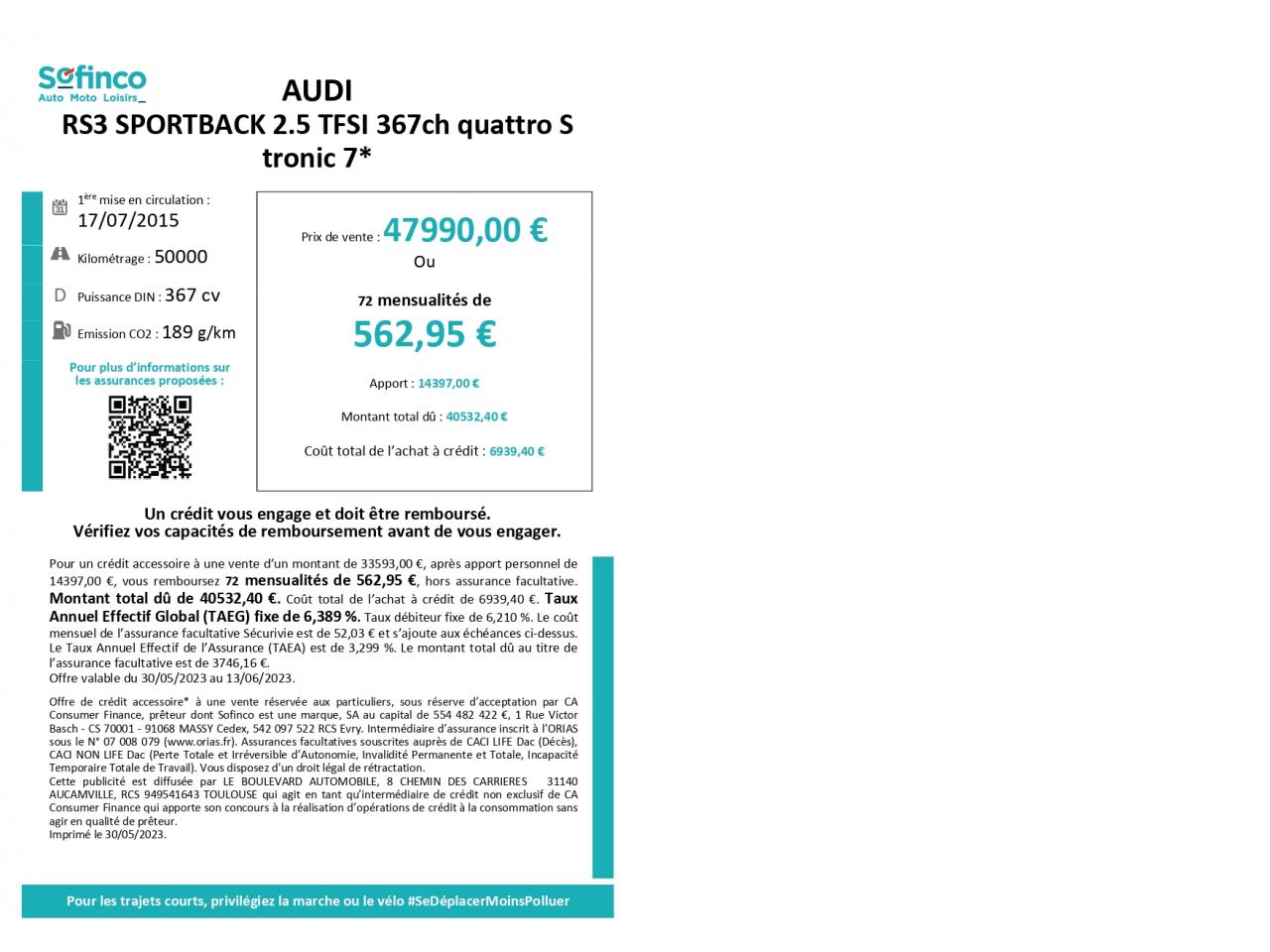 Nous vous proposons cette AUDI RS3 au prix de 47 990 €, celle-ci a au compteur 49978 km. Elle a été immatriculée le 17-07-2015 et dispose d'une puissance de 367ch din.