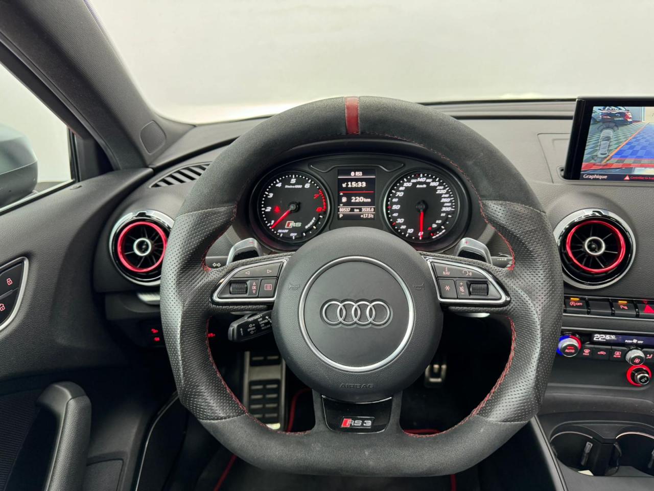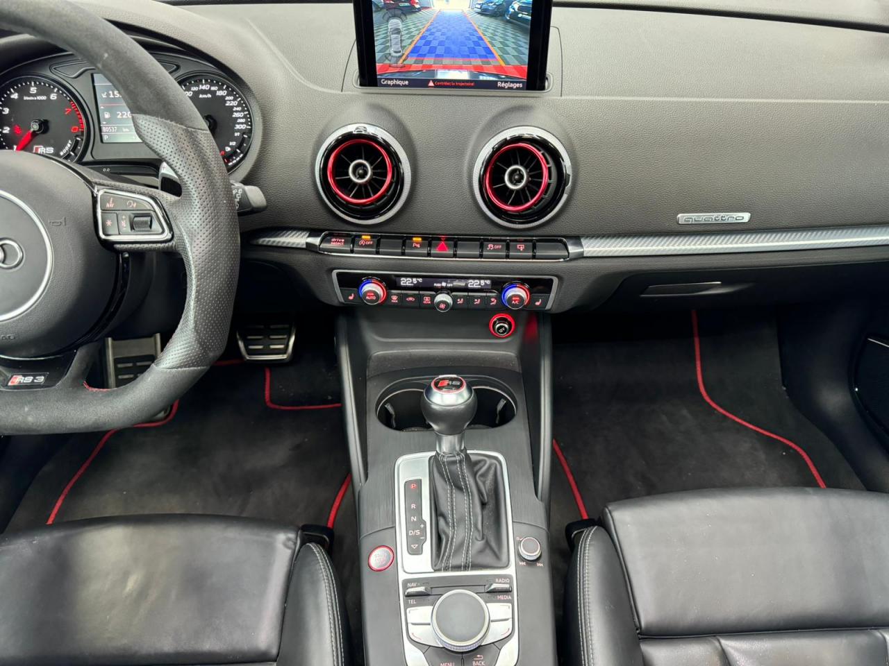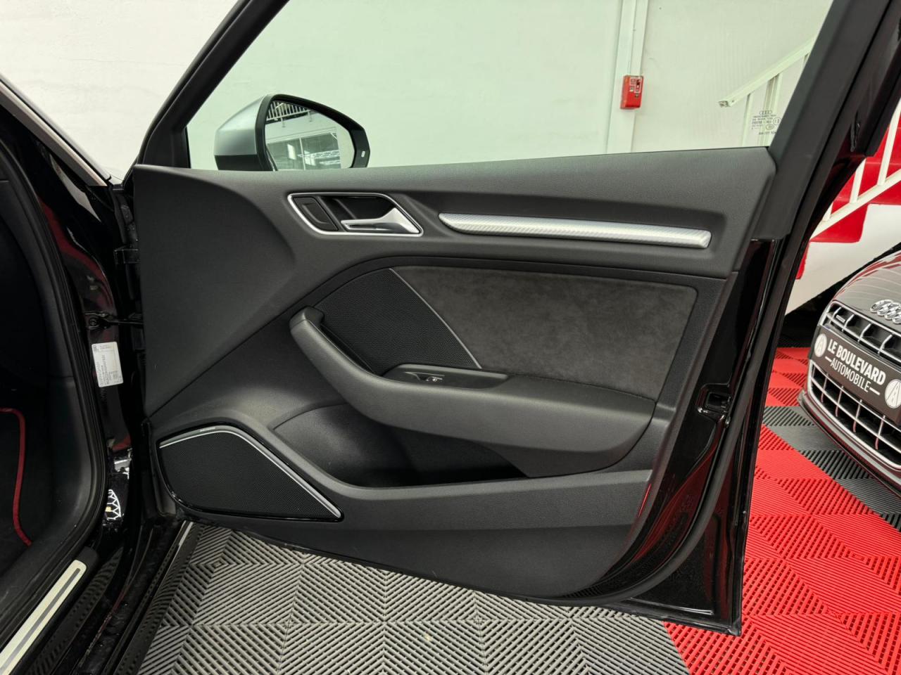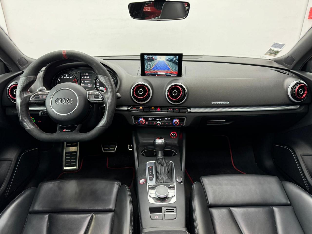 4 oeilletons de fixation dans le coffreAccoudoir central avant, avec vide-poches relevable, inclinaison réglable et coulissant en longueurAdvanced key : système de verrouillage et de déverrouillage du véhicule sans utilisation de la clé. Démarrage et arrêt du moteur main libre par touche Start/StopAiles avant avec passages de roues élargisAirbag de genoux coté conducteurAirbags grand volume pour conducteur et passager avantAirbags latéraux à l'avant intégrés au dossier des siègesAlarme antivol incluant protection volumétrique de l'habitacle et protection antiremorquage par capteur d'inclinaison désactivableAllume-cigare et cendrier amovible, couvercle chromé avec anneaux Audi, allume-cigare sur la console centrale au lieu de la prise 12 volts de sérieApplications décoratives sur les contre-portes et tableau de bord style "3D noir"ASR (antipatinage)Assistance hydraulique au freinage d'urgenceAssistant de freinage en cas de collision, en cas d'accidentAudi Drive Select : différents réglages du véhicule à travers trois modesAudi parking system plus : signal acoustique et visuel d'aide au stationnement avant et arrière par pictogrammes sur l'écranAudi Premium Tracking SystemAudi Sound System avec 10 haut-parleursBaguettes décoratives sur les vitres latérales style aluminium mat ; revêtement noir brillant sur les montants de pavillon centraux extérieurs et les triangles de portières arrièreBecquet arrière RS3 laqué dans la couleur de la carrosserie, au niveau du pavillon avec inserts aérodynamiques latéraux noir brillantBoîte à gants grand volume côté passager avant, éclairéeCache-bagages amovibleCalandre Audi singleframe avec grille de calandre à structure alvéolée noir brillant et encadrement d'une seule pièce style aluminium mat ; ouvertures d'entrées d'air en noir brillantCarrosserie galvaniséeCeintures de sécurité 3 points automatiques pour toutes les places, prétensionneurs pyrotechniques, réglage des ceintures en hauteur à l'avant ; limiteurs de tension sur toutes les places extérieuresChâssis Sport RSCiel de pavillon en tissu noirClé à fréquence radio, avec emblème RSClimatisation automatique Confort avec réglage asservi à la position du soleil, réglage de température gauche/droite séparéContrôle de ceinture attachée pour toutes les places ; un signal acoustique et visuel à l'avant prévient lorsque la ceinture n'est pas fixée, un signal visuel à l'arrière attire l'attention sur la fixation des ceinturesContrôle de pression des pneus ( TPMS )Contrôle électronique de stabilisation (ESC) désactivableDétecteur de pluie et de luminosité incluant pare-brise avec bande grise sur la partie supérieureDirection progressive contribuant à une augmentation de la dynamique de conduite grâce à une démultiplication directe et progressiveDisques de frein ventilés à l'arrièreDisques de frein Wave en matériau composite, ventilés et perforés à l'avantDossier de banquette arrière rabattable en deux parties 40/60 ou complètementEcrous antivolEDS (blocage électronique de différentiel)Essuie-glace arrière à déclenchement automatique au passage de la marche arrièreEtriers laqués noir extra brillant, avec inscription RS à l'avantExtensions de bas de caisse couleur carrosserieFeux arrière avec feux de recul blancs et feux de brouillard arrière, incluant troisième feu stop surélevé et éclairage de plaque à LEDFeux de freinage adaptatifs (déclenchement des feux de détresse automatique)Feux de route assistés : gestion automatique du passage de feux de croisement à pleins phares et inversementFixation pour sièges enfants ISOFIX et Top Tether pour les places arrière extérieuresFrein de stationnement electromécaniqueIdentification du modèle/technologie sur le capot de coffreInscription "quattro" sur le tableau de bord côté passagerInscription quattro sur la calandre, le capot de coffre et le tableau de bord côté passagerInscriptions RS3 sur la calandre, le capot de coffre, les baguettes des seuils de portes, le volant Sport, le pommeau de levier de vitesses et le compte-toursJantes en aluminium coulé Audi Sport style 5 branches en hélice, avec pneus 235/35 R 19 91Y XLLave-essuie-glace 2 vitesses, 4 intervalles de balayage réglablesLève-vitres à l'avant et à l'arrière, électriques, avec protection antipincement, ouverture/fermeture par le verrouillage centralisé, fonction ouverture/fermeture par impulsionLunette arrière dégivrante, avec minuterie; chauffage supplémentaire de l'extrémité inférieure de l'essuie-glace arrièreMiroir de courtoisie côté conducteur et passagerMMI GPS plus avec données de navigationOutillage de bord dans le coffre incluant un cricPack aluminium intérieurPack EclairagePack rangement + Pack coffrePare-brise acoustiquePare-chocs RS : style dynamique et sportif, larges prises d'air à l'avant en noir brillant ainsi que lame horizontale laquée dans la couleur de carrosserie, diffuseur noir brillant à l'arrièrePare-soleil rabattables et pivotants, côtés conducteur et passager avant, avec miroir de courtoisie occultablePatères à vêtements sur les montants de pavillon centraux, à gauche et à droite, simplesPédalier et repose-pied en acier inoxydablePoignées de maintien. 4 poignées avec mécanisme amortisseur, rabattables, encastrées dans le pavillonPréparation pour téléphone portable (Bluetooth), commande sur volant multifonction, mains libres et audiostreamingProtection antidémarrage électronique intégrée à la gestion du moteur ; activation automatique par la clé du véhiculeProtection latérale anticollision avec barres extrêmement rigides dans les portières et une structure latérale de carrosserie renforcée, particulièrement dans les montants de pavillon centraux et les seuils de portièresQuattro : transmission intégrale permanenteRangements dans les contre-portes à l'avant avec casier de rangement pour boissons, rangements dans l