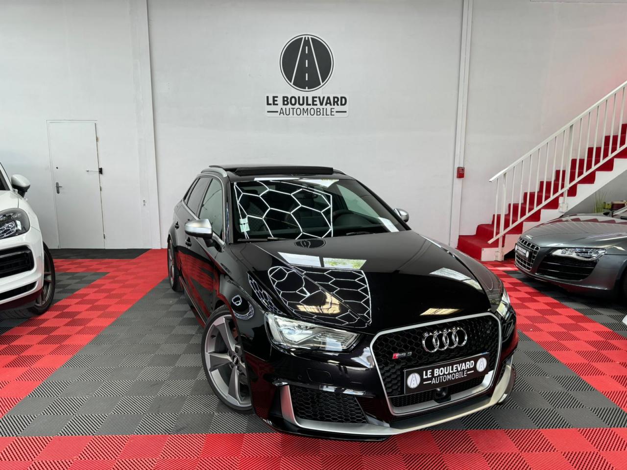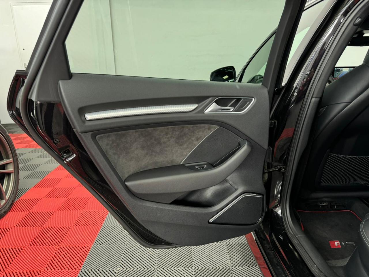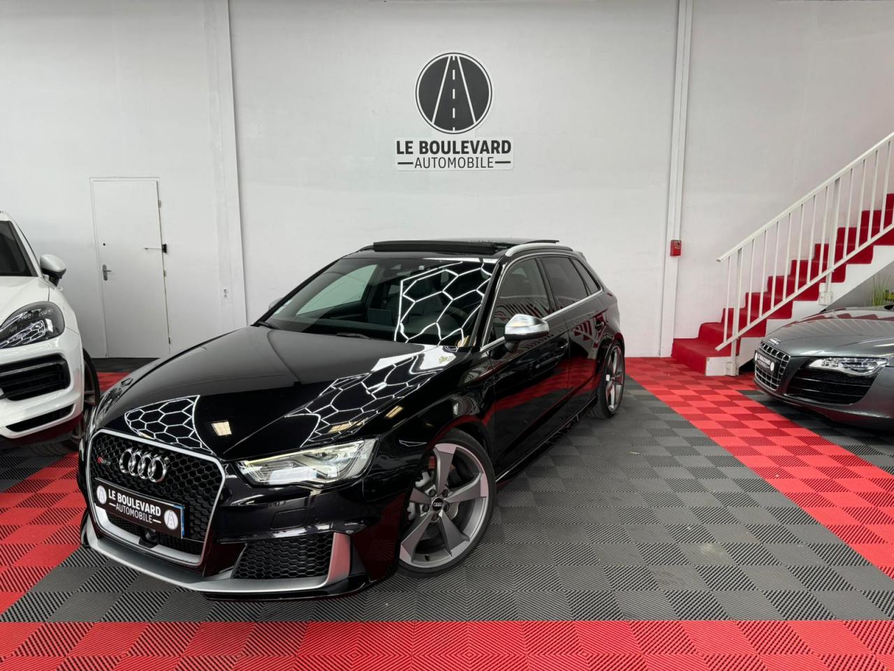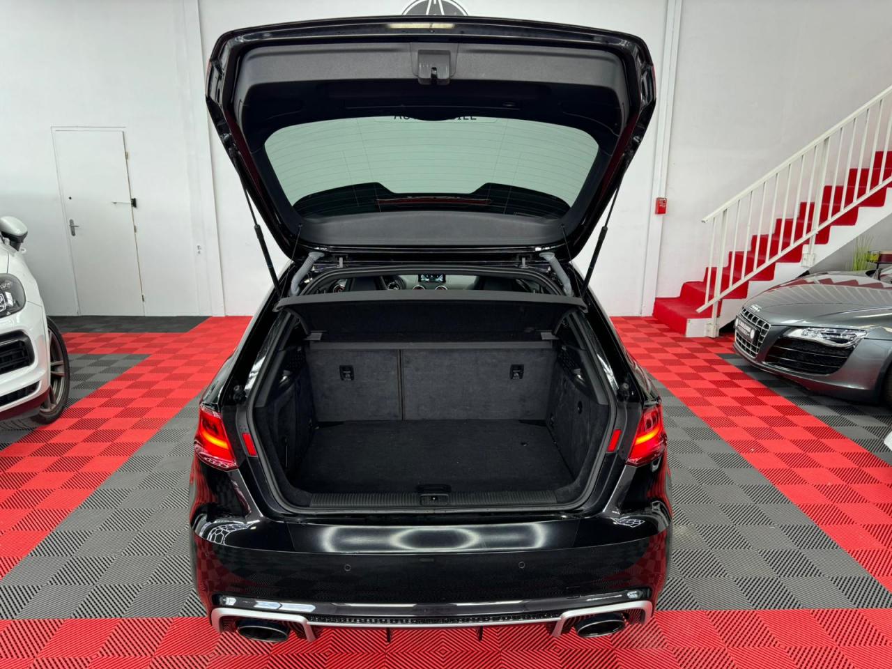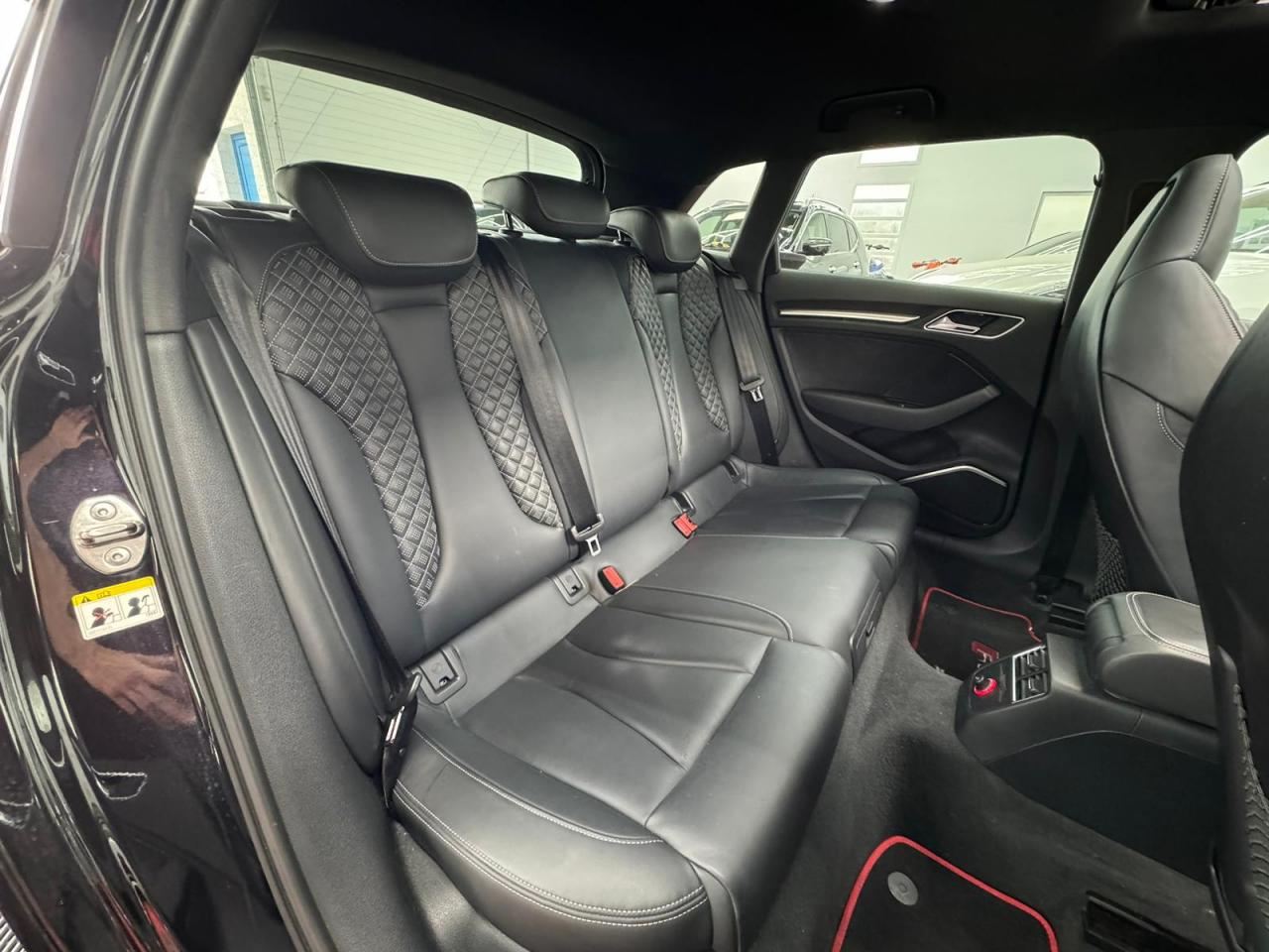 4 oeilletons de fixation dans le coffreAccoudoir central avant, avec vide-poches relevable, inclinaison réglable et coulissant en longueurAdvanced key : système de verrouillage et de déverrouillage du véhicule sans utilisation de la clé. Démarrage et arrêt du moteur main libre par touche Start/StopAiles avant avec passages de roues élargisAirbag de genoux coté conducteurAirbags grand volume pour conducteur et passager avantAirbags latéraux à l'avant intégrés au dossier des siègesAlarme antivol incluant protection volumétrique de l'habitacle et protection antiremorquage par capteur d'inclinaison désactivableAllume-cigare et cendrier amovible, couvercle chromé avec anneaux Audi, allume-cigare sur la console centrale au lieu de la prise 12 volts de sérieApplications décoratives sur les contre-portes et tableau de bord style "3D noir"ASR (antipatinage)Assistance hydraulique au freinage d'urgenceAssistant de freinage en cas de collision, en cas d'accidentAudi Drive Select : différents réglages du véhicule à travers trois modesAudi parking system plus : signal acoustique et visuel d'aide au stationnement avant et arrière par pictogrammes sur l'écranAudi Premium Tracking SystemAudi Sound System avec 10 haut-parleursBaguettes décoratives sur les vitres latérales style aluminium mat ; revêtement noir brillant sur les montants de pavillon centraux extérieurs et les triangles de portières arrièreBecquet arrière RS3 laqué dans la couleur de la carrosserie, au niveau du pavillon avec inserts aérodynamiques latéraux noir brillantBoîte à gants grand volume côté passager avant, éclairéeCache-bagages amovibleCalandre Audi singleframe avec grille de calandre à structure alvéolée noir brillant et encadrement d'une seule pièce style aluminium mat ; ouvertures d'entrées d'air en noir brillantCarrosserie galvaniséeCeintures de sécurité 3 points automatiques pour toutes les places, prétensionneurs pyrotechniques, réglage des ceintures en hauteur à l'avant ; limiteurs de tension sur toutes les places extérieuresChâssis Sport RSCiel de pavillon en tissu noirClé à fréquence radio, avec emblème RSClimatisation automatique Confort avec réglage asservi à la position du soleil, réglage de température gauche/droite séparéContrôle de ceinture attachée pour toutes les places ; un signal acoustique et visuel à l'avant prévient lorsque la ceinture n'est pas fixée, un signal visuel à l'arrière attire l'attention sur la fixation des ceinturesContrôle de pression des pneus ( TPMS )Contrôle électronique de stabilisation (ESC) désactivableDétecteur de pluie et de luminosité incluant pare-brise avec bande grise sur la partie supérieureDirection progressive contribuant à une augmentation de la dynamique de conduite grâce à une démultiplication directe et progressiveDisques de frein ventilés à l'arrièreDisques de frein Wave en matériau composite, ventilés et perforés à l'avantDossier de banquette arrière rabattable en deux parties 40/60 ou complètementEcrous antivolEDS (blocage électronique de différentiel)Essuie-glace arrière à déclenchement automatique au passage de la marche arrièreEtriers laqués noir extra brillant, avec inscription RS à l'avantExtensions de bas de caisse couleur carrosserieFeux arrière avec feux de recul blancs et feux de brouillard arrière, incluant troisième feu stop surélevé et éclairage de plaque à LEDFeux de freinage adaptatifs (déclenchement des feux de détresse automatique)Feux de route assistés : gestion automatique du passage de feux de croisement à pleins phares et inversementFixation pour sièges enfants ISOFIX et Top Tether pour les places arrière extérieuresFrein de stationnement electromécaniqueIdentification du modèle/technologie sur le capot de coffreInscription "quattro" sur le tableau de bord côté passagerInscription quattro sur la calandre, le capot de coffre et le tableau de bord côté passagerInscriptions RS3 sur la calandre, le capot de coffre, les baguettes des seuils de portes, le volant Sport, le pommeau de levier de vitesses et le compte-toursJantes en aluminium coulé Audi Sport style 5 branches en hélice, avec pneus 235/35 R 19 91Y XLLave-essuie-glace 2 vitesses, 4 intervalles de balayage réglablesLève-vitres à l'avant et à l'arrière, électriques, avec protection antipincement, ouverture/fermeture par le verrouillage centralisé, fonction ouverture/fermeture par impulsionLunette arrière dégivrante, avec minuterie; chauffage supplémentaire de l'extrémité inférieure de l'essuie-glace arrièreMiroir de courtoisie côté conducteur et passagerMMI GPS plus avec données de navigationOutillage de bord dans le coffre incluant un cricPack aluminium intérieurPack EclairagePack rangement + Pack coffrePare-brise acoustiquePare-chocs RS : style dynamique et sportif, larges prises d'air à l'avant en noir brillant ainsi que lame horizontale laquée dans la couleur de carrosserie, diffuseur noir brillant à l'arrièrePare-soleil rabattables et pivotants, côtés conducteur et passager avant, avec miroir de courtoisie occultablePatères à vêtements sur les montants de pavillon centraux, à gauche et à droite, simplesPédalier et repose-pied en acier inoxydablePoignées de maintien. 4 poignées avec mécanisme amortisseur, rabattables, encastrées dans le pavillonPréparation pour téléphone portable (Bluetooth), commande sur volant multifonction, mains libres et audiostreamingProtection antidémarrage électronique intégrée à la gestion du moteur ; activation automatique par la clé du véhiculeProtection latérale anticollision avec barres extrêmement rigides dans les portières et une structure latérale de carrosserie renforcée, particulièrement dans les montants de pavillon centraux et les seuils de portièresQuattro : transmission intégrale permanenteRangements dans les contre-portes à l'avant avec casier de rangement pour boissons, rangements dans l