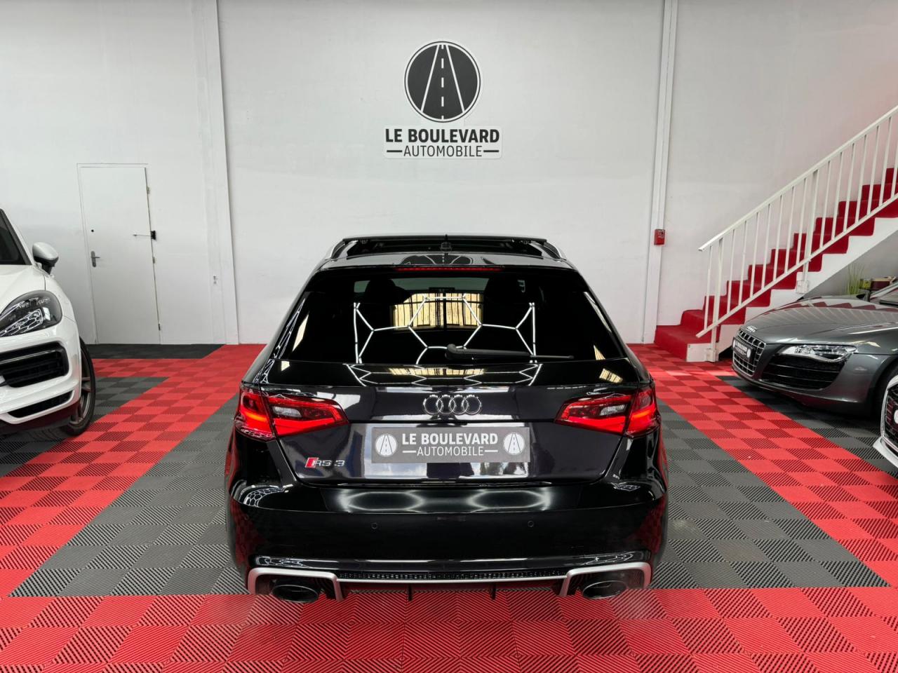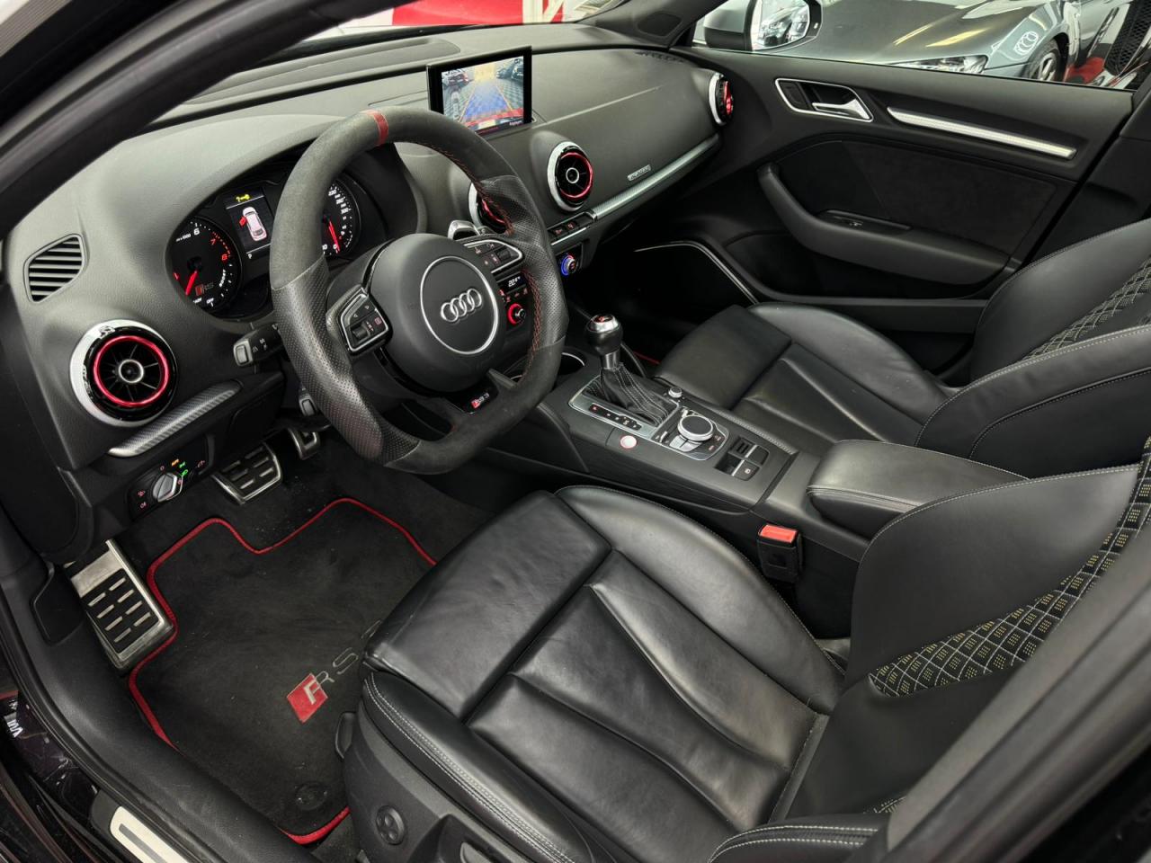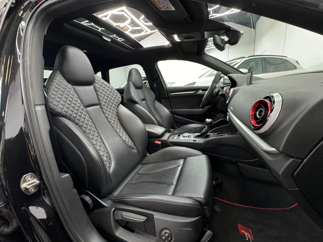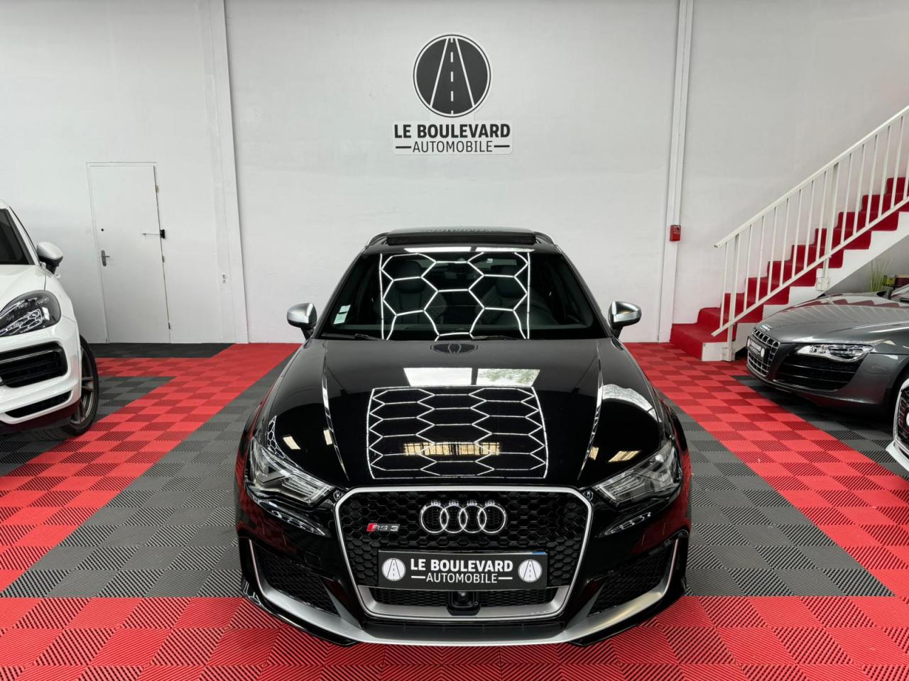 4 oeilletons de fixation dans le coffreAccoudoir central avant, avec vide-poches relevable, inclinaison réglable et coulissant en longueurAdvanced key : système de verrouillage et de déverrouillage du véhicule sans utilisation de la clé. Démarrage et arrêt du moteur main libre par touche Start/StopAiles avant avec passages de roues élargisAirbag de genoux coté conducteurAirbags grand volume pour conducteur et passager avantAirbags latéraux à l'avant intégrés au dossier des siègesAlarme antivol incluant protection volumétrique de l'habitacle et protection antiremorquage par capteur d'inclinaison désactivableAllume-cigare et cendrier amovible, couvercle chromé avec anneaux Audi, allume-cigare sur la console centrale au lieu de la prise 12 volts de sérieApplications décoratives sur les contre-portes et tableau de bord style "3D noir"ASR (antipatinage)Assistance hydraulique au freinage d'urgenceAssistant de freinage en cas de collision, en cas d'accidentAudi Drive Select : différents réglages du véhicule à travers trois modesAudi parking system plus : signal acoustique et visuel d'aide au stationnement avant et arrière par pictogrammes sur l'écranAudi Premium Tracking SystemAudi Sound System avec 10 haut-parleursBaguettes décoratives sur les vitres latérales style aluminium mat ; revêtement noir brillant sur les montants de pavillon centraux extérieurs et les triangles de portières arrièreBecquet arrière RS3 laqué dans la couleur de la carrosserie, au niveau du pavillon avec inserts aérodynamiques latéraux noir brillantBoîte à gants grand volume côté passager avant, éclairéeCache-bagages amovibleCalandre Audi singleframe avec grille de calandre à structure alvéolée noir brillant et encadrement d'une seule pièce style aluminium mat ; ouvertures d'entrées d'air en noir brillantCarrosserie galvaniséeCeintures de sécurité 3 points automatiques pour toutes les places, prétensionneurs pyrotechniques, réglage des ceintures en hauteur à l'avant ; limiteurs de tension sur toutes les places extérieuresChâssis Sport RSCiel de pavillon en tissu noirClé à fréquence radio, avec emblème RSClimatisation automatique Confort avec réglage asservi à la position du soleil, réglage de température gauche/droite séparéContrôle de ceinture attachée pour toutes les places ; un signal acoustique et visuel à l'avant prévient lorsque la ceinture n'est pas fixée, un signal visuel à l'arrière attire l'attention sur la fixation des ceinturesContrôle de pression des pneus ( TPMS )Contrôle électronique de stabilisation (ESC) désactivableDétecteur de pluie et de luminosité incluant pare-brise avec bande grise sur la partie supérieureDirection progressive contribuant à une augmentation de la dynamique de conduite grâce à une démultiplication directe et progressiveDisques de frein ventilés à l'arrièreDisques de frein Wave en matériau composite, ventilés et perforés à l'avantDossier de banquette arrière rabattable en deux parties 40/60 ou complètementEcrous antivolEDS (blocage électronique de différentiel)Essuie-glace arrière à déclenchement automatique au passage de la marche arrièreEtriers laqués noir extra brillant, avec inscription RS à l'avantExtensions de bas de caisse couleur carrosserieFeux arrière avec feux de recul blancs et feux de brouillard arrière, incluant troisième feu stop surélevé et éclairage de plaque à LEDFeux de freinage adaptatifs (déclenchement des feux de détresse automatique)Feux de route assistés : gestion automatique du passage de feux de croisement à pleins phares et inversementFixation pour sièges enfants ISOFIX et Top Tether pour les places arrière extérieuresFrein de stationnement electromécaniqueIdentification du modèle/technologie sur le capot de coffreInscription "quattro" sur le tableau de bord côté passagerInscription quattro sur la calandre, le capot de coffre et le tableau de bord côté passagerInscriptions RS3 sur la calandre, le capot de coffre, les baguettes des seuils de portes, le volant Sport, le pommeau de levier de vitesses et le compte-toursJantes en aluminium coulé Audi Sport style 5 branches en hélice, avec pneus 235/35 R 19 91Y XLLave-essuie-glace 2 vitesses, 4 intervalles de balayage réglablesLève-vitres à l'avant et à l'arrière, électriques, avec protection antipincement, ouverture/fermeture par le verrouillage centralisé, fonction ouverture/fermeture par impulsionLunette arrière dégivrante, avec minuterie; chauffage supplémentaire de l'extrémité inférieure de l'essuie-glace arrièreMiroir de courtoisie côté conducteur et passagerMMI GPS plus avec données de navigationOutillage de bord dans le coffre incluant un cricPack aluminium intérieurPack EclairagePack rangement + Pack coffrePare-brise acoustiquePare-chocs RS : style dynamique et sportif, larges prises d'air à l'avant en noir brillant ainsi que lame horizontale laquée dans la couleur de carrosserie, diffuseur noir brillant à l'arrièrePare-soleil rabattables et pivotants, côtés conducteur et passager avant, avec miroir de courtoisie occultablePatères à vêtements sur les montants de pavillon centraux, à gauche et à droite, simplesPédalier et repose-pied en acier inoxydablePoignées de maintien. 4 poignées avec mécanisme amortisseur, rabattables, encastrées dans le pavillonPréparation pour téléphone portable (Bluetooth), commande sur volant multifonction, mains libres et audiostreamingProtection antidémarrage électronique intégrée à la gestion du moteur ; activation automatique par la clé du véhiculeProtection latérale anticollision avec barres extrêmement rigides dans les portières et une structure latérale de carrosserie renforcée, particulièrement dans les montants de pavillon centraux et les seuils de portièresQuattro : transmission intégrale permanenteRangements dans les contre-portes à l'avant avec casier de rangement pour boissons, rangements dans l