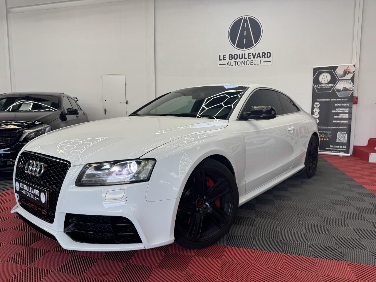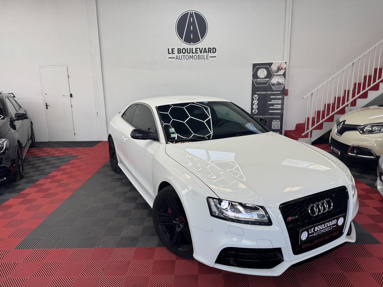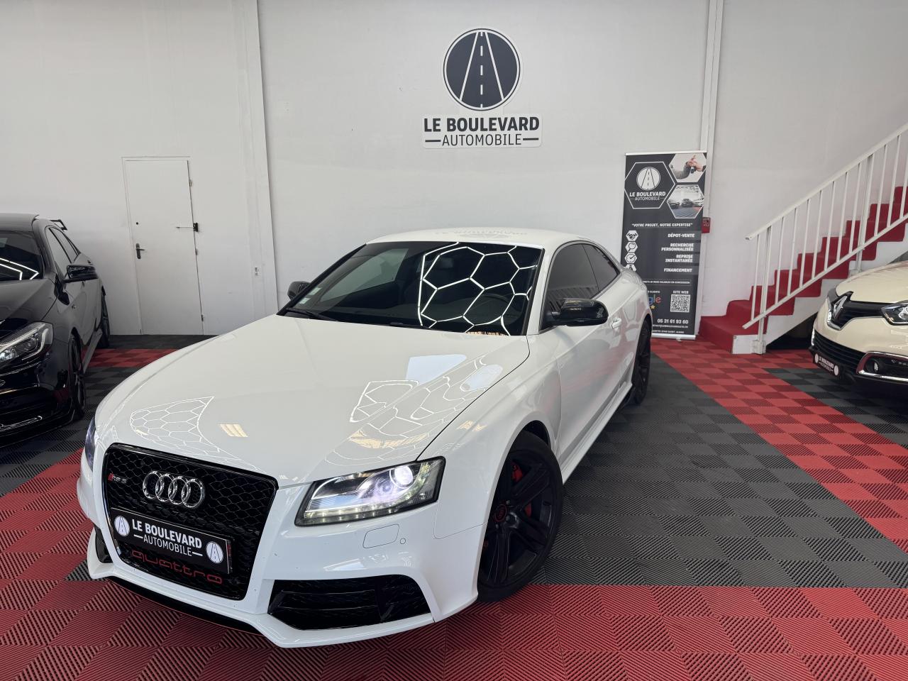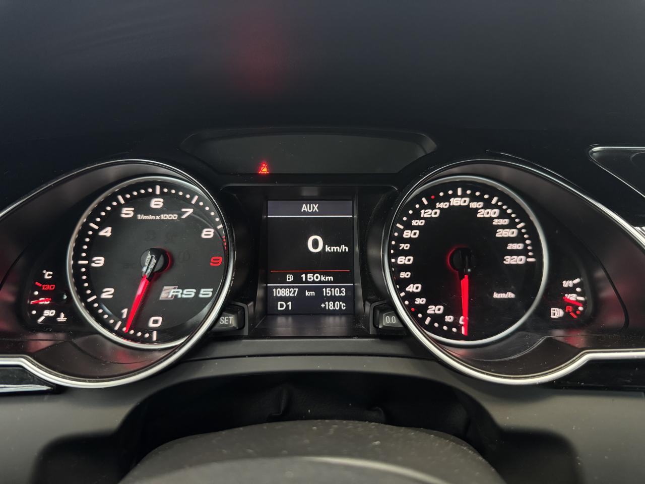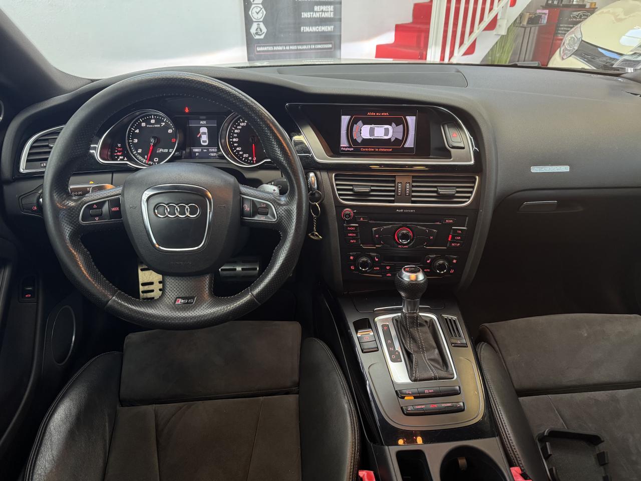 4 oeilletons de fixation dans le coffre4 œilletons de fixation dans le coffre, pour maintenir les bagages et objets ; points d'accrochage pour le filet mixteAccoudoir central avant avec vide-poches et 2 prises 12 VAccoudoir central dans le dossier des sièges arrière, rabattable ; compartiment avec trousse de secoursAffichage de la température extérieure dans le système d'information du conducteurAirbags grand volume pour conducteur et passager avant avec détecteur de la position d'assise ; airbag adaptatif pour le conducteur et passager avantAirbags grand volume pour le conducteur et le passagerAirbags latéraux (airbag thorax et bassin à l'avant)Alarme antivol : surveille l'habitacle, autoradio, portes, capot moteur et de coffreAllume-cigare intégré dans le cendrierAntipatinage ASR : empêche le patinage des roues motrices ; assure une motricité optimaleApplications décoratives en carbone sur contre-portes et console centraleApplications décoratives spécifiques en piano laqué noir autour de l'instrumentation et de l'écran du MMIAppuie-tête, réglables à l'avant et à l'arrièreAudi Drive Select : différents réglages du véhicule à travers trois modesAudi Hold Assist : système désactivable maintenant le véhicule à l'arrêt en descente comme en côte; permet un redémarrage confortable sans mettre le frein à mainAudi Premium Tracking System : système de localisation et d'immobilisation par satellite couplé à l'alarme antivolAvertisseur deux tons sur le moyeu du volantBlocage électronique de diff érentiel EDS, aide au démarrage intervenant jusqu'à une vitesse d'environ 100 km/hBlocage électronique de différentiel (EDS)Boîte automatique S tronic 7 vitesses à double embrayage, passage en mode manuel possible à l'aide du sélecteur ou des palettes situées derrière le volantBouclier avant avec larges prises d'air en structure nid d'abeilles, avec double baguette horizontale et lame de bas de bouclier anthracite brillantesCalandre Singleframe : grille anthracite brillante en structure nid d'abeilles et cadre en aluminium matCapot de coffre à ouverture automatiqueCarrosserie galvaniséeCeintures de sécurité, automatiques à trois points pour les quatre placesCeintures de sécurité, automatiques à trois points pour les quatre places, contrôle de port de ceinture à l'avant, couleur assortie à celle de l'habitacleCendriers dans la console centrale à l'avant et à l'arrièreChangeur 6 CD compatible MP3 ou WMA dans la boîte à gantsChâssis Sport RSChâssis Sport RS avec suspension et amortisseurs plus fermes pour un contact plus direct avec la chaussée et une conduite sportiveCiel de pavillon en tissu noir ou argent étoile au choixClimatisation automatique Confort 3 zones à fonctionnalités étendues et affichage numériqueClimatisation automatique Confort Plus 3 zonesColonne de direction de sécuritéContact d'allumage électronique, clé de contact mémorisant différentes données d'entretienContrôle de la pression des pneumatiquesCric de levageDétecteur de pluie et allumage automatique des projecteursDirection assistée ServotronicDossier des sièges arrière rabattable séparément, avec déverrouillage à distance des dossiers depuis le coffreEclairage intérieur à extinction temporisée et contacteurs sur toutes les portièresEcrous antivolEntourage de vitres en aluminium, revêtement noir brillant sur les montants de pavillon centraux et les triangles des portières arrièreEntourages de vitre en aluminium, revêtement noir brillant sur les montants de pavillon centraux et les triangles des portières arrièreEtriers de freins laqués noir avec logo RS 5Etui à lunettes sur le module de pavillonÉtui à lunettes, dans le module d'éclairage intérieur avant, au-dessus du rétroviseur intérieurFeux de route assistés : gestion automatique du passage de feux de croisement à pleins phares et inversementFrein de stationnement electromécaniqueGPS Plus : système de navigation GPSIndicateur d'usure des disques à l'avantIndicateur de rapport de vitesse dans le système d'information du conducteur : apporte assistance au conducteur dans le choix du rapport de vitesse adaptéInscriptions RS 5 sur les seuils de portes, les étriers de freins, la calandre, la malle de coffre, le volant, le levier de vitesses S tronic, le compte-tours et la cléInstrumentation à éclairage réglableInstrumentation avec éclairage réglable, tachymètre électronique avec compteur kilométrique totalisateur et journalier, compte-tours, horloge, indicateur de température du liquide de refroidissement et jauge de carburantJantes en aluminium coulé style RS, 5 branches "Structure", 9 J x 19, avec pneus 265/35 R19Lave-glace, deux vitesses, 4 réglages d'intermittence, balayage coup par coup et lavage-balayage automatiqueLève-vitres électriques à l'avant avec protection antipincement, fonction ouverture/fermeture confort par impulsions ; vitres arrière fixesLunette arrière dégivrante, avec minuterieMoulures de seuils de portes avec insert en aluminium badgé RS 5Ordinateur de bord couleur et contrôle AutocheckOrdinateur de bord couleur et système de contrôle AutocheckOutillage de bord dans le coffreOuverture de coffre automatiquePack EclairagePeinture métallisée ou nacréePoignées de maintien amorties, rabattables à 2 positions, encastrées dans le ciel de pavillonPoignées de portières extérieures laquées dans la couleur de carrosserie, poignées cintrées agréables à utiliserPommeau de levier de vitesses en cuir perforé avec badge RS 5 ; soufflet en cuir avec surpiqûres gris pierrePorte-boissons sur la console centralePréparation ISOFIX pour sièges latéraux arrière et siège passager avantPréparation pour téléphone 2 W bi-bande (D et E), commande sur volant multifonctionPréparation pour téléphone 2 W bi-bande (D et E), sans support pour adatateur ni antenne de toit, commande sur volant multifonction, main libre, interface BluetoothP