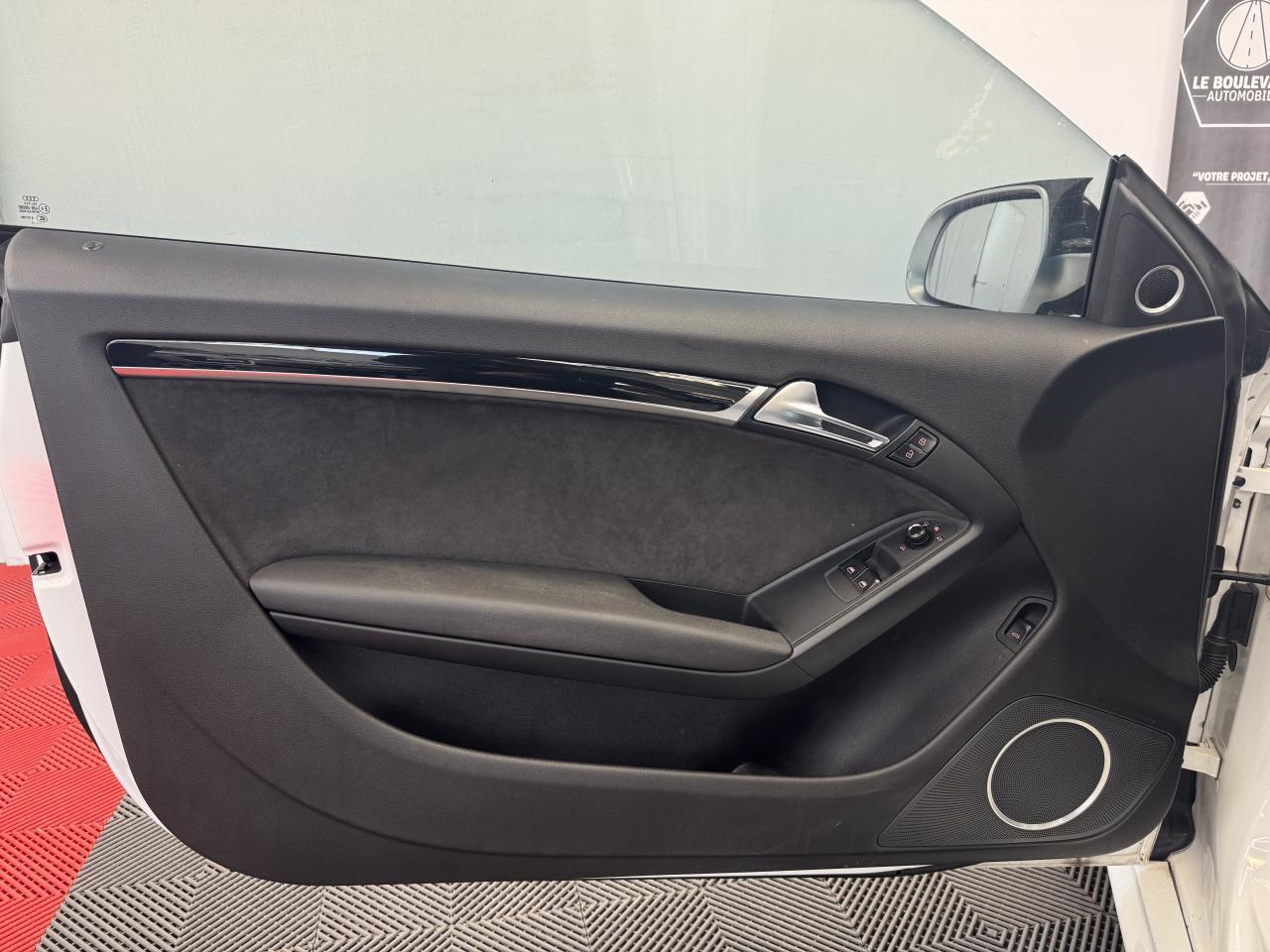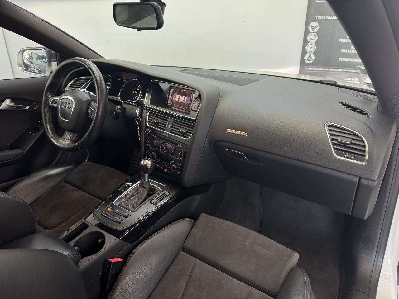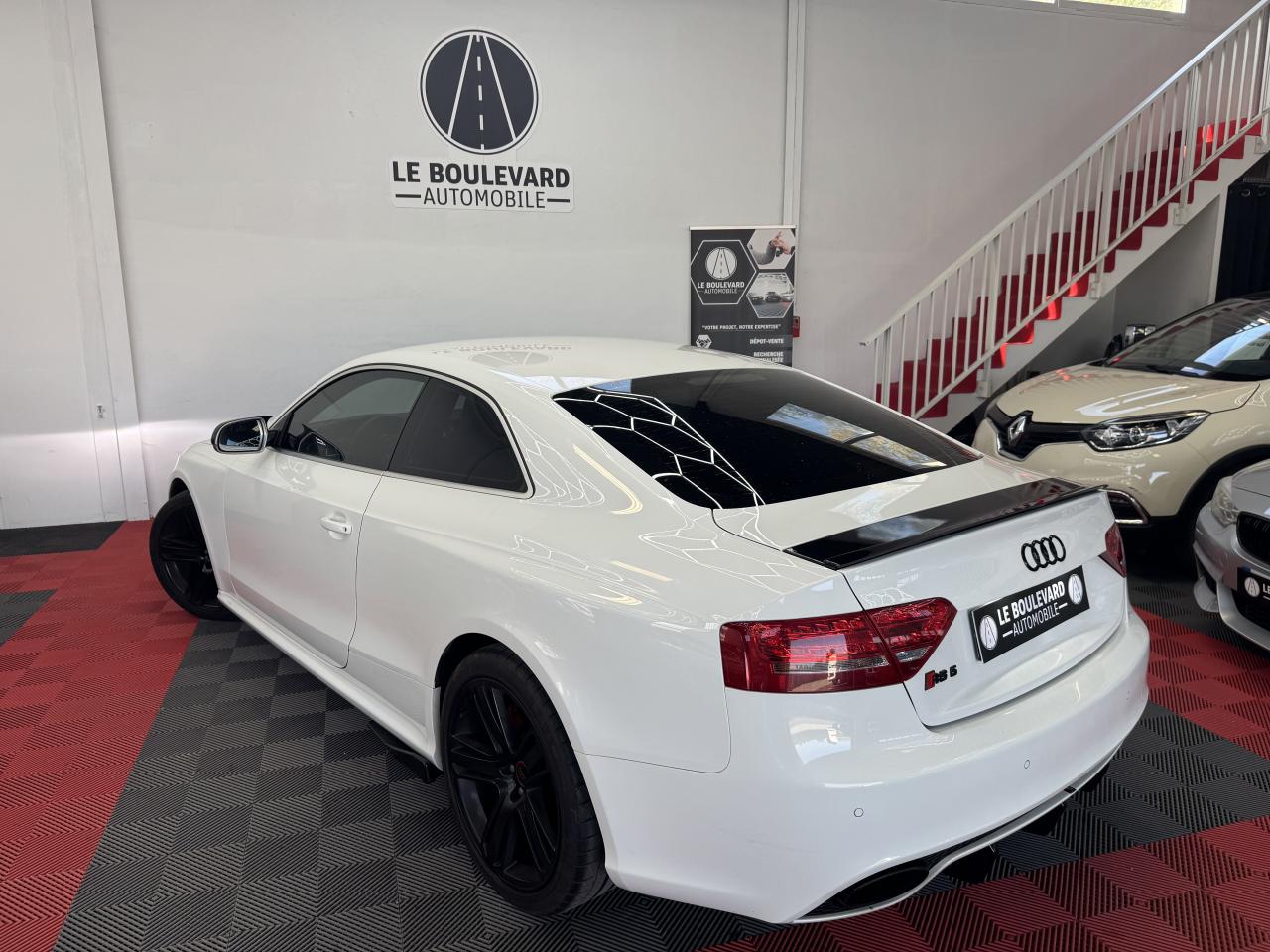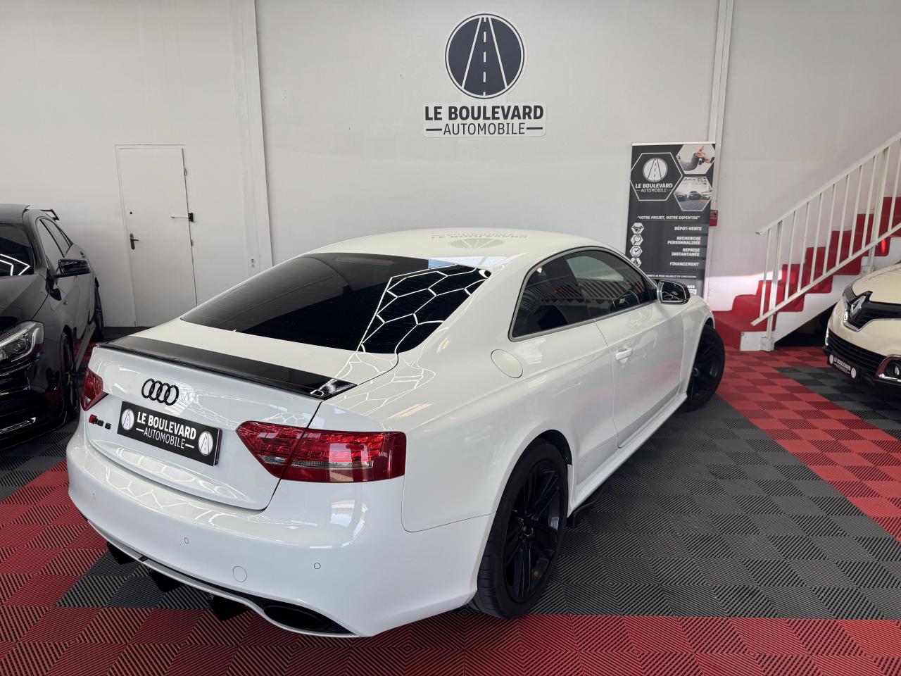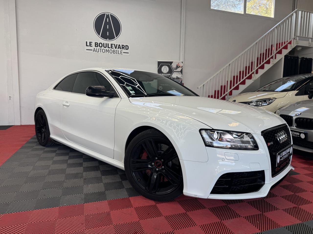 4 oeilletons de fixation dans le coffre4 œilletons de fixation dans le coffre, pour maintenir les bagages et objets ; points d'accrochage pour le filet mixteAccoudoir central avant avec vide-poches et 2 prises 12 VAccoudoir central dans le dossier des sièges arrière, rabattable ; compartiment avec trousse de secoursAffichage de la température extérieure dans le système d'information du conducteurAirbags grand volume pour conducteur et passager avant avec détecteur de la position d'assise ; airbag adaptatif pour le conducteur et passager avantAirbags grand volume pour le conducteur et le passagerAirbags latéraux (airbag thorax et bassin à l'avant)Alarme antivol : surveille l'habitacle, autoradio, portes, capot moteur et de coffreAllume-cigare intégré dans le cendrierAntipatinage ASR : empêche le patinage des roues motrices ; assure une motricité optimaleApplications décoratives en carbone sur contre-portes et console centraleApplications décoratives spécifiques en piano laqué noir autour de l'instrumentation et de l'écran du MMIAppuie-tête, réglables à l'avant et à l'arrièreAudi Drive Select : différents réglages du véhicule à travers trois modesAudi Hold Assist : système désactivable maintenant le véhicule à l'arrêt en descente comme en côte; permet un redémarrage confortable sans mettre le frein à mainAudi Premium Tracking System : système de localisation et d'immobilisation par satellite couplé à l'alarme antivolAvertisseur deux tons sur le moyeu du volantBlocage électronique de diff érentiel EDS, aide au démarrage intervenant jusqu'à une vitesse d'environ 100 km/hBlocage électronique de différentiel (EDS)Boîte automatique S tronic 7 vitesses à double embrayage, passage en mode manuel possible à l'aide du sélecteur ou des palettes situées derrière le volantBouclier avant avec larges prises d'air en structure nid d'abeilles, avec double baguette horizontale et lame de bas de bouclier anthracite brillantesCalandre Singleframe : grille anthracite brillante en structure nid d'abeilles et cadre en aluminium matCapot de coffre à ouverture automatiqueCarrosserie galvaniséeCeintures de sécurité, automatiques à trois points pour les quatre placesCeintures de sécurité, automatiques à trois points pour les quatre places, contrôle de port de ceinture à l'avant, couleur assortie à celle de l'habitacleCendriers dans la console centrale à l'avant et à l'arrièreChangeur 6 CD compatible MP3 ou WMA dans la boîte à gantsChâssis Sport RSChâssis Sport RS avec suspension et amortisseurs plus fermes pour un contact plus direct avec la chaussée et une conduite sportiveCiel de pavillon en tissu noir ou argent étoile au choixClimatisation automatique Confort 3 zones à fonctionnalités étendues et affichage numériqueClimatisation automatique Confort Plus 3 zonesColonne de direction de sécuritéContact d'allumage électronique, clé de contact mémorisant différentes données d'entretienContrôle de la pression des pneumatiquesCric de levageDétecteur de pluie et allumage automatique des projecteursDirection assistée ServotronicDossier des sièges arrière rabattable séparément, avec déverrouillage à distance des dossiers depuis le coffreEclairage intérieur à extinction temporisée et contacteurs sur toutes les portièresEcrous antivolEntourage de vitres en aluminium, revêtement noir brillant sur les montants de pavillon centraux et les triangles des portières arrièreEntourages de vitre en aluminium, revêtement noir brillant sur les montants de pavillon centraux et les triangles des portières arrièreEtriers de freins laqués noir avec logo RS 5Etui à lunettes sur le module de pavillonÉtui à lunettes, dans le module d'éclairage intérieur avant, au-dessus du rétroviseur intérieurFeux de route assistés : gestion automatique du passage de feux de croisement à pleins phares et inversementFrein de stationnement electromécaniqueGPS Plus : système de navigation GPSIndicateur d'usure des disques à l'avantIndicateur de rapport de vitesse dans le système d'information du conducteur : apporte assistance au conducteur dans le choix du rapport de vitesse adaptéInscriptions RS 5 sur les seuils de portes, les étriers de freins, la calandre, la malle de coffre, le volant, le levier de vitesses S tronic, le compte-tours et la cléInstrumentation à éclairage réglableInstrumentation avec éclairage réglable, tachymètre électronique avec compteur kilométrique totalisateur et journalier, compte-tours, horloge, indicateur de température du liquide de refroidissement et jauge de carburantJantes en aluminium coulé style RS, 5 branches "Structure", 9 J x 19, avec pneus 265/35 R19Lave-glace, deux vitesses, 4 réglages d'intermittence, balayage coup par coup et lavage-balayage automatiqueLève-vitres électriques à l'avant avec protection antipincement, fonction ouverture/fermeture confort par impulsions ; vitres arrière fixesLunette arrière dégivrante, avec minuterieMoulures de seuils de portes avec insert en aluminium badgé RS 5Ordinateur de bord couleur et contrôle AutocheckOrdinateur de bord couleur et système de contrôle AutocheckOutillage de bord dans le coffreOuverture de coffre automatiquePack EclairagePeinture métallisée ou nacréePoignées de maintien amorties, rabattables à 2 positions, encastrées dans le ciel de pavillonPoignées de portières extérieures laquées dans la couleur de carrosserie, poignées cintrées agréables à utiliserPommeau de levier de vitesses en cuir perforé avec badge RS 5 ; soufflet en cuir avec surpiqûres gris pierrePorte-boissons sur la console centralePréparation ISOFIX pour sièges latéraux arrière et siège passager avantPréparation pour téléphone 2 W bi-bande (D et E), commande sur volant multifonctionPréparation pour téléphone 2 W bi-bande (D et E), sans support pour adatateur ni antenne de toit, commande sur volant multifonction, main libre, interface BluetoothP