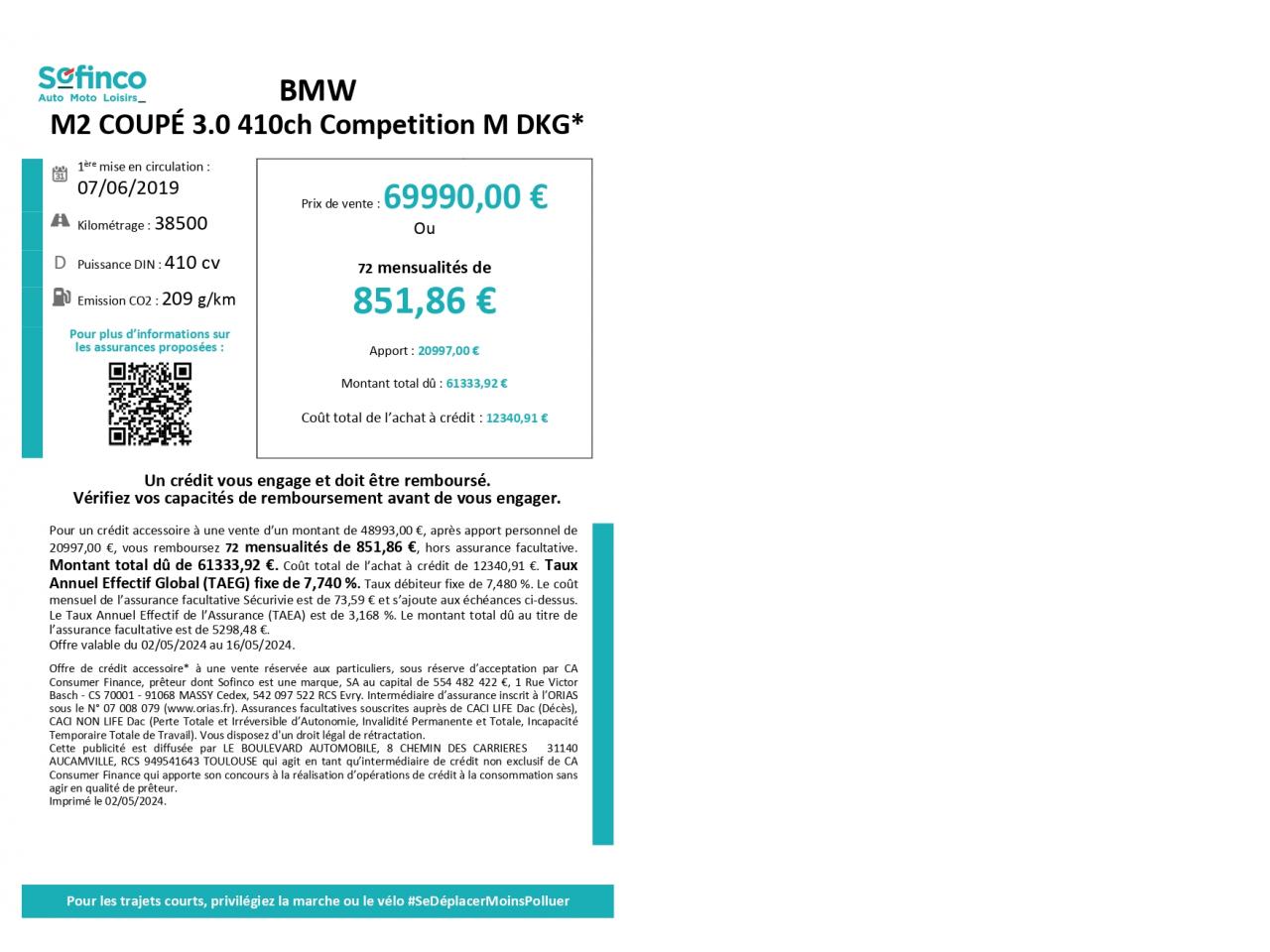 Nous vous proposons cette BMW SERIE 2 au prix de 69 990 €, celle-ci a au compteur 38500 km. Elle a été immatriculée le 07-06-2019 et dispose d'une puissance de 410ch din.
