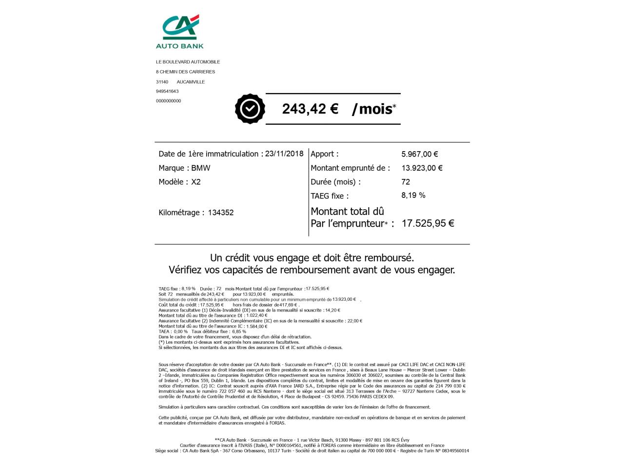Nous vous proposons cette BMW X2 au prix de 19 890 €, celle-ci a au compteur 134352 km. Elle a été immatriculée le 23-11-2018 et dispose d'une puissance de 150ch din.