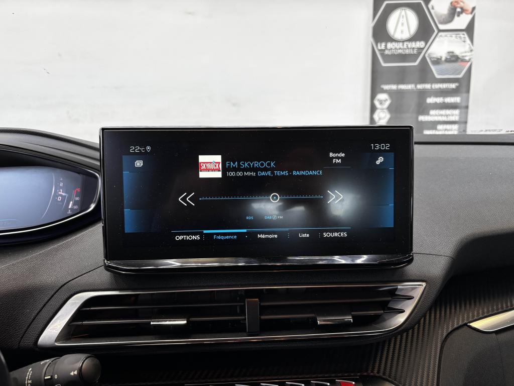 ABS avec répartiteur électronique de freinage (REF) et aide au freinage d'urgence (AFU)Accoudoir central avant à ouverture papillon, avec compartiment de rangement éclairé et réfrigérablegarantie peugeot fevrier 2027Aide graphique et sonore au stationnement arrièreAir conditionné automatique bi-zone avec aérateurs aux places arrièreAirbags frontaux conducteur et passager adaptatifs (airbag passager déconnectable)Airbags latéraux conducteur et passager avantAirbags rideaux de tête aux places avant et arrièreAlerte active de franchissement involontaire de ligne et bas côtéAppuis-tête à sécurité optimisée réglables en hauteur sur les sièges conducteur et passager avant ainsi que sur les places latérales arrièresAvertisseur de temps de conduiteBadge STYLE sur les ailes avantBanquette arrière rabattable (2/3 -1/3) avec modularité Magic FlatBarres de toit Noir SatinBoîte à gants floquée et éclairéeCalandre à damier chroméCeintures de sécurité arrière trois points à enrouleur (x3), avec prétensionneurs et limiteurs d'effort aux places latéralesCeintures de sécurité avant trois points à enrouleur, réglables en hauteur avec prétensionneurs et limiteurs d'effortCommande de verrouillage à distance (deux plips)Contrôle dynamique de stabilité CDS avec antipatinage électronique ASRCoques de rétroviseurs extérieurs Noir Perla NeraDécors de planche de bord et panneaux de portes aspect carboneDécors intérieurs (baguettes de planche de bord et panneaux de portes, enjoliveur de console) chromésDémarrage mains libresDétection de sous-gonflage indirecteDirection assistée électrique, avec colonne de direction réglable en hauteur et profondeur (mécanique)Eco modeEnjoliveurs d'arc de pavillon en inoxEnjoliveurs en inox sur les protecteurs de bas de portesEssuie-glace arrière avec déclenchement automatique en marche arrièreEssuie-vitre avant avec système de lavage 'Magic Wash'Etiquettes "STYLE" sur les sièges avantsFixations pour trois sièges enfants suivant norme ISOFIX aux places passager avant et latérales arrièreFonction 'Mirror Screen' (Apple Carplay / Android Auto)Frein de stationnement électrique avec aide au démarrage en penteGarnissage tri matières PNEUMA 3D, surpiqûres Bleu AzureIndicateur de rapport conseilléInserts d'ailes avant chromésJantes alliage 17" 'Chicago'Kit de dépannage pneumatiqueLève-vitres électriques avant et arrière, séquentiels et antipincementLunette arrière chauffante avec antennes sérigraphiéesNavigation 3D connectée avec reconnaissance vocale, écran tactile capacitif 10" HDPack City 1Pack SafetyPack VisibilitéPassages de roues rapportés noirsPeinture métallisée Bleu CélèbesPeugeot i-Cockpit : combiné tête haute numérique haute qualité d'affichage, écran tactile capacitif 8" et volant compact multi-fonctionsPlafonnier avec spots de lecture avant (x2) et arrière (x2)Plancher de coffre deux positionsPoches aumônières au dos des sièges avantPrise USB (dans la zone connectique)Prises 12V (x3 : zone connectique, arrière de console et coffre)Projecteurs 'Peugeot LED Technology' avec feux diurnes à LED sous projecteursRadio avec fonction DAB (Radio Numérique Terrestre), bi-tuner compatible MP3 et connectivité Bluetooth (audio streaming, kit mains libres), avec commandes au volant, 6 HP, écran tactile capacitif 8"Reconnaissance étendue des panneaux de signalisation et préconisation de vitesseRégulateur et limiteur de vitesseRétroviseurs extérieurs électriques et dégivrants, rabattables électriquement avec éclairage d'accueil à LEDSabot de pare-choc avant gris métalliséSécurité enfant électrique des vitres arrièreSeuils de portes avant en inoxSiège conducteur et passager réglables en hauteurSurtapis aux places avant et arrièreToggle Switches' chromés (touches 'piano' d'activation des fonctions de l'écran tactile)Verrouillage automatique de tous les ouvrants en roulantVitres latérales et lunette arrière surteintéesVolant croûte de cuir